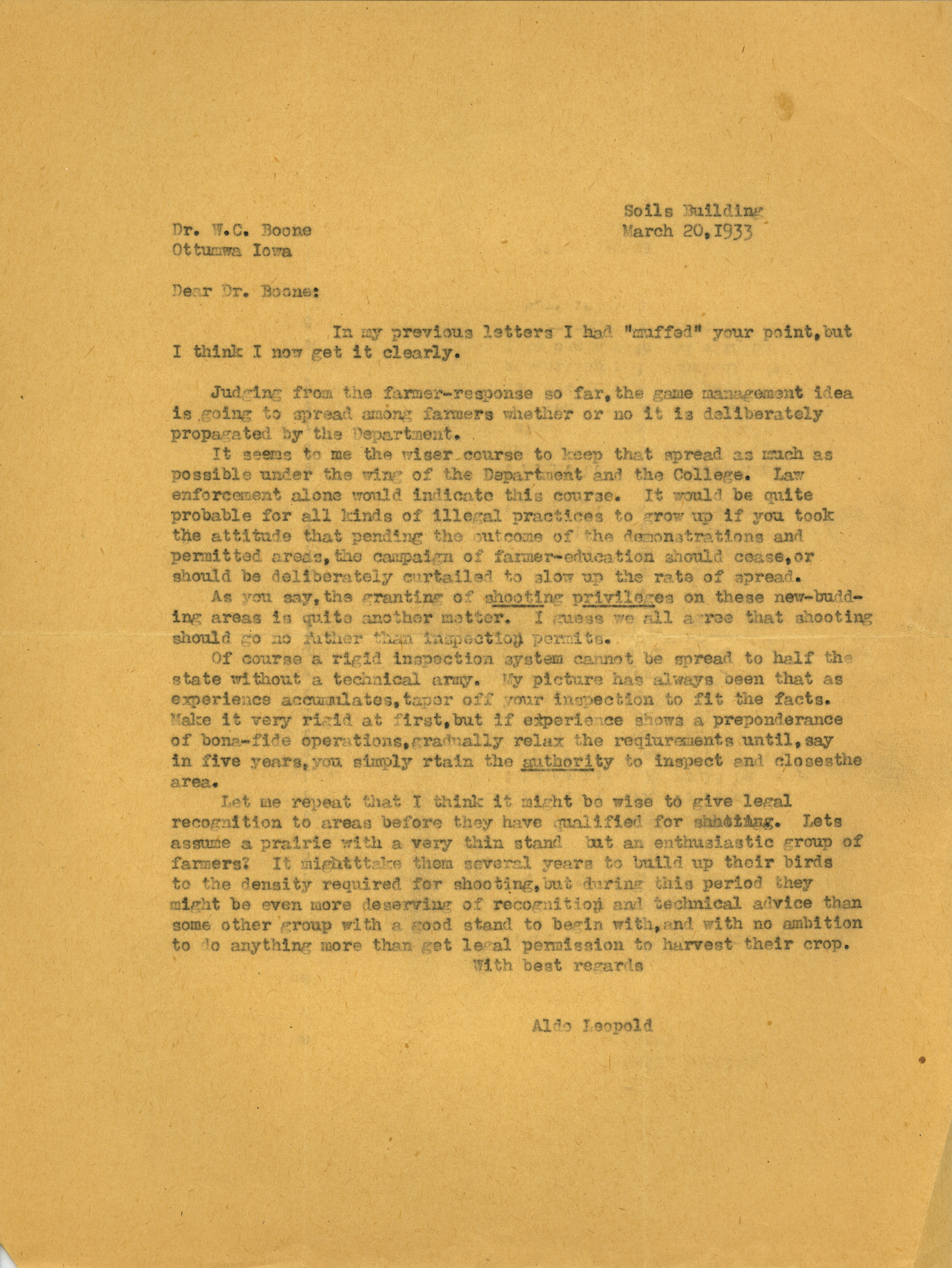 Aldo Leopold letter to Boone, March 20, 1933 Item Info