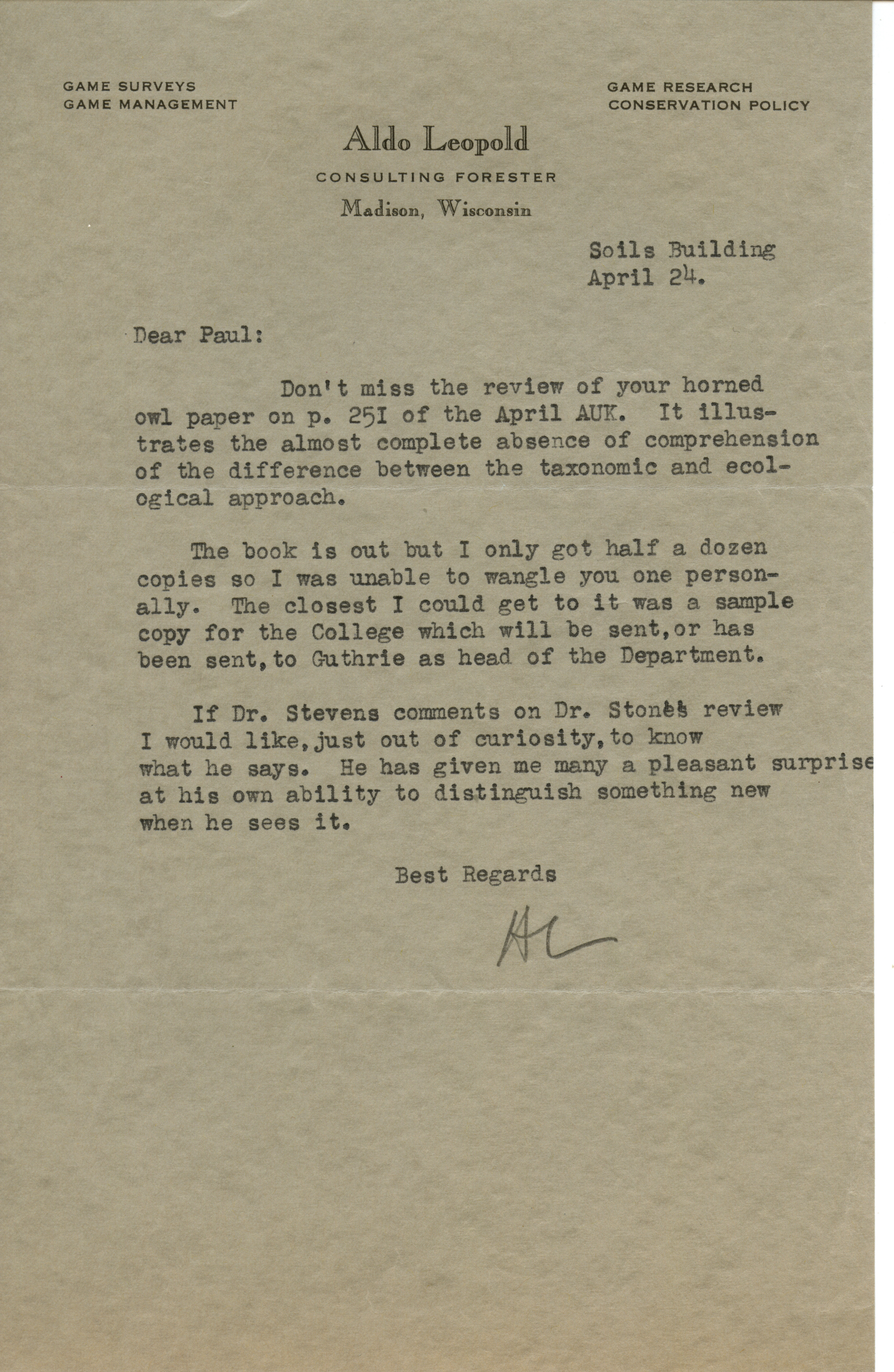 - Aldo Leopold letter to Paul Errington, April 24, 1933