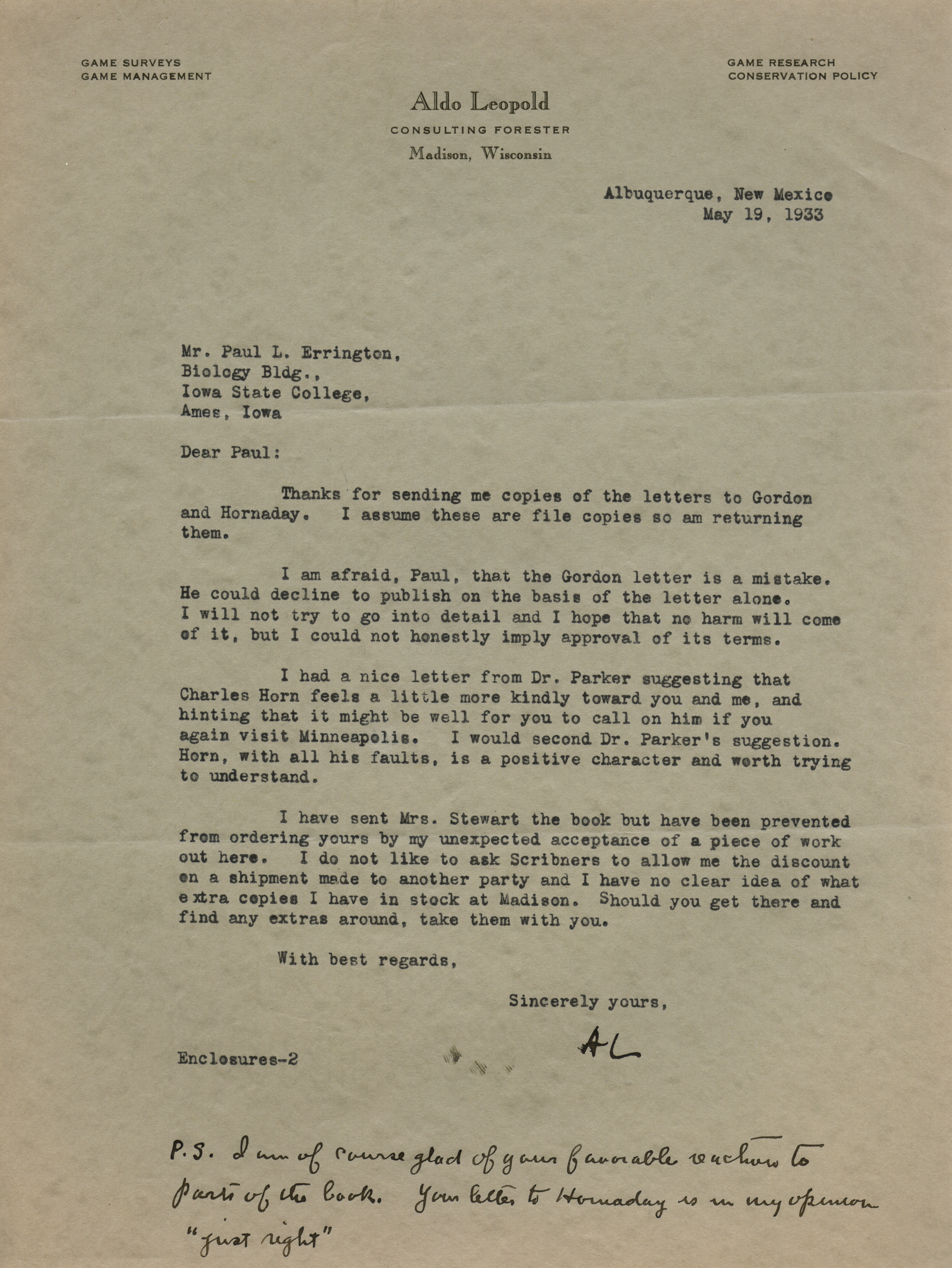 - Aldo Leopold letter to Paul Errington, May 19, 1933