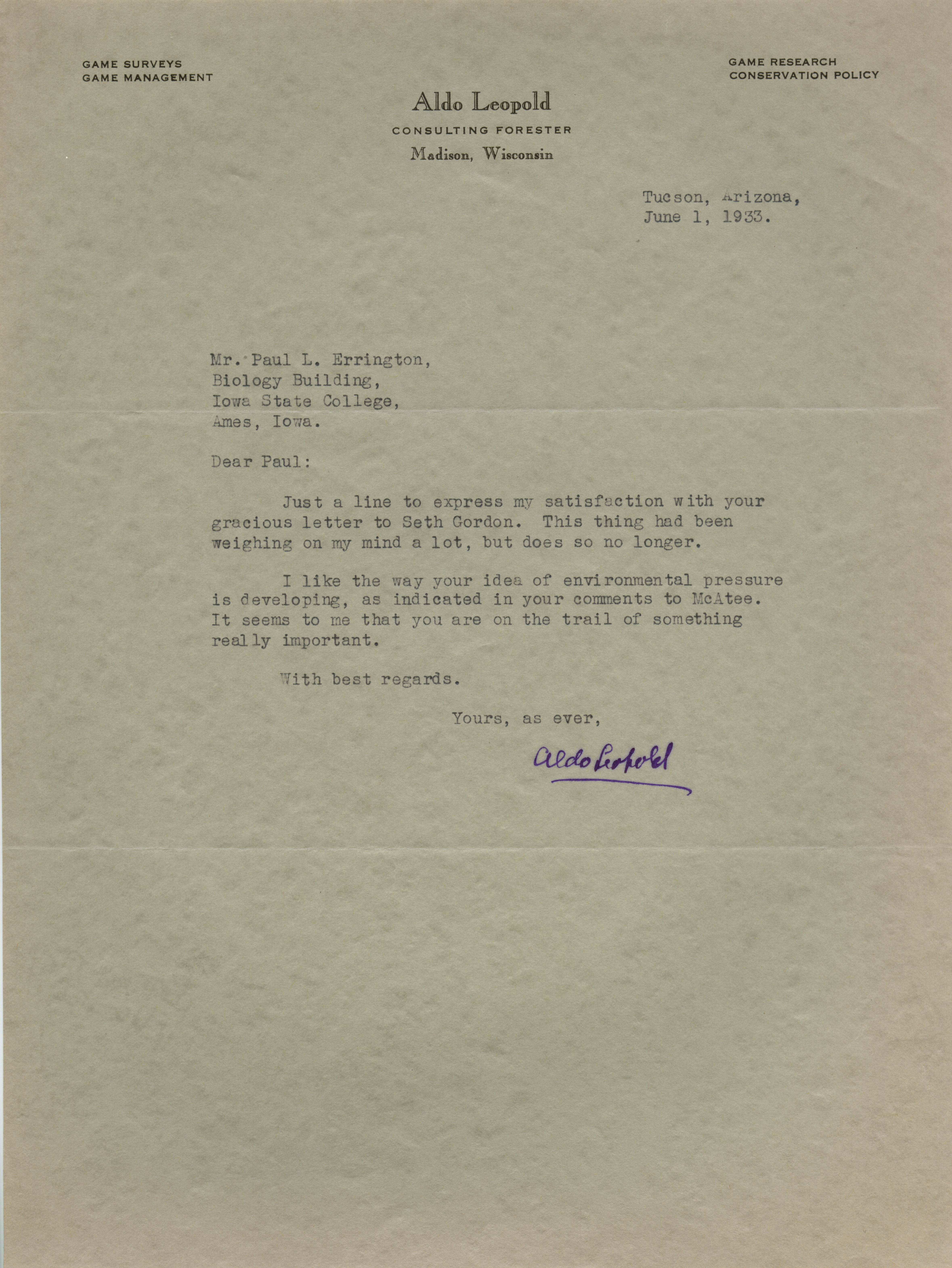 - Aldo Leopold letter to Paul Errington, June 1, 1933
