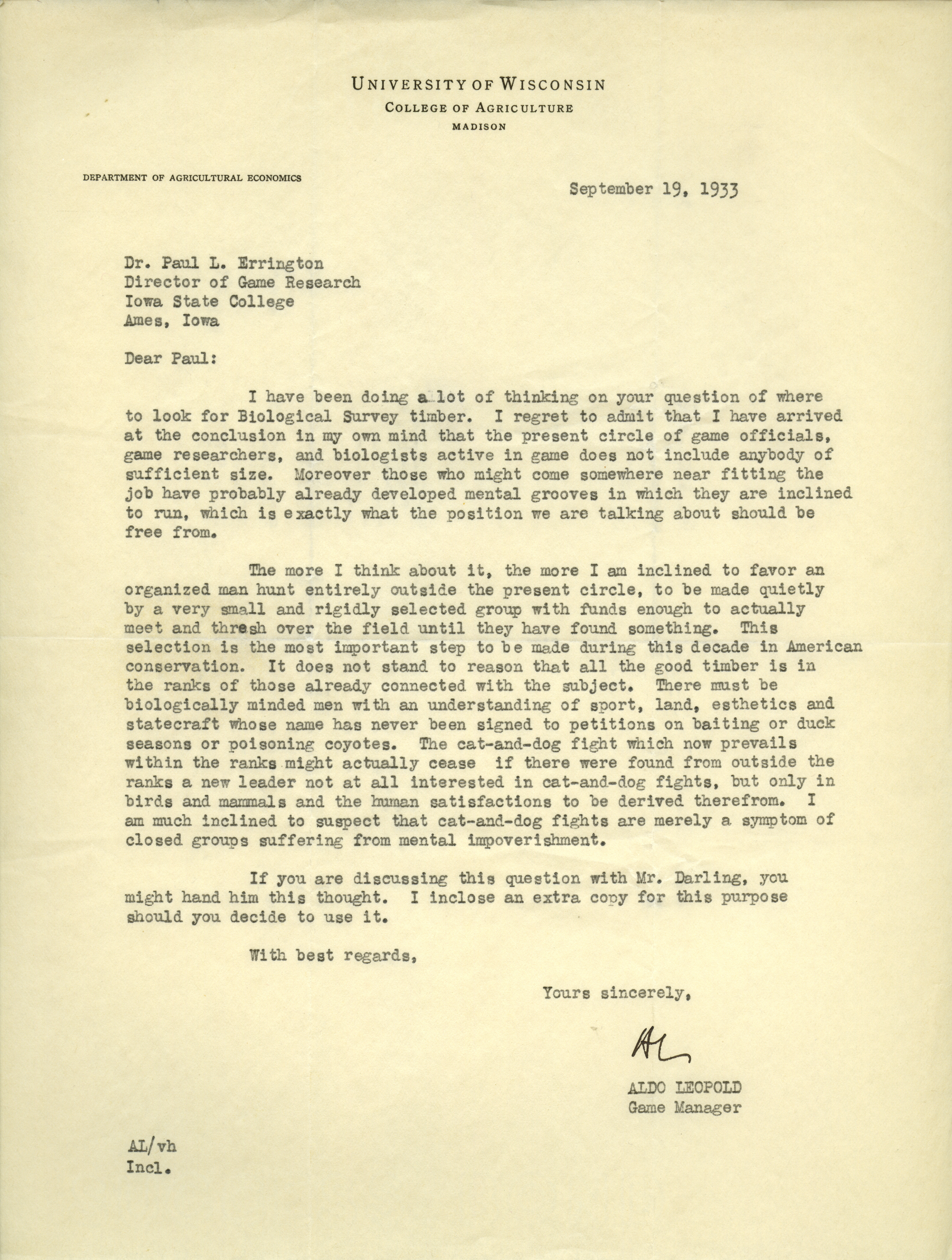 - Aldo Leopold letter to Paul Errington, September 19, 1933