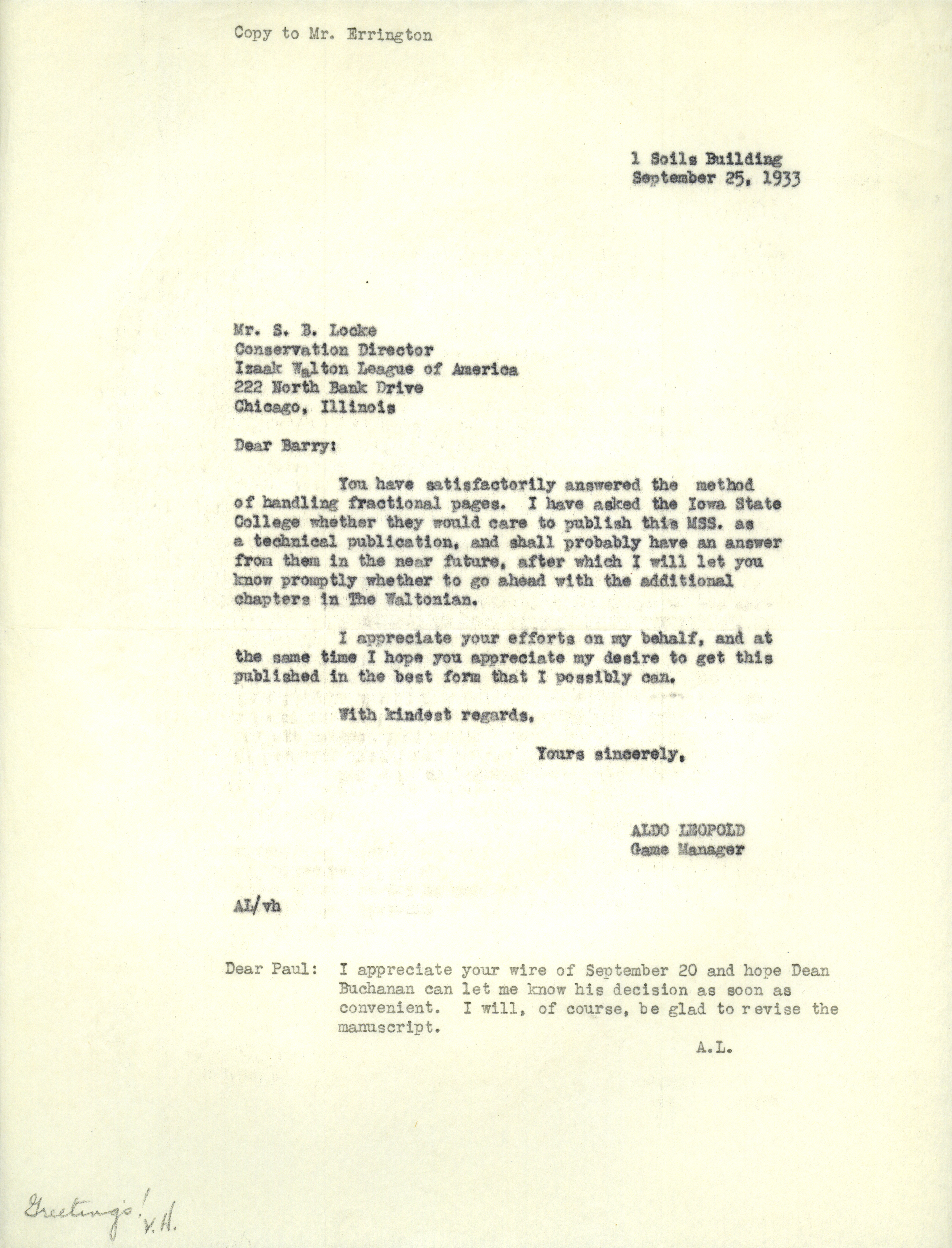 Aldo Leopold letter to Locke, September 25, 1933 Item Info