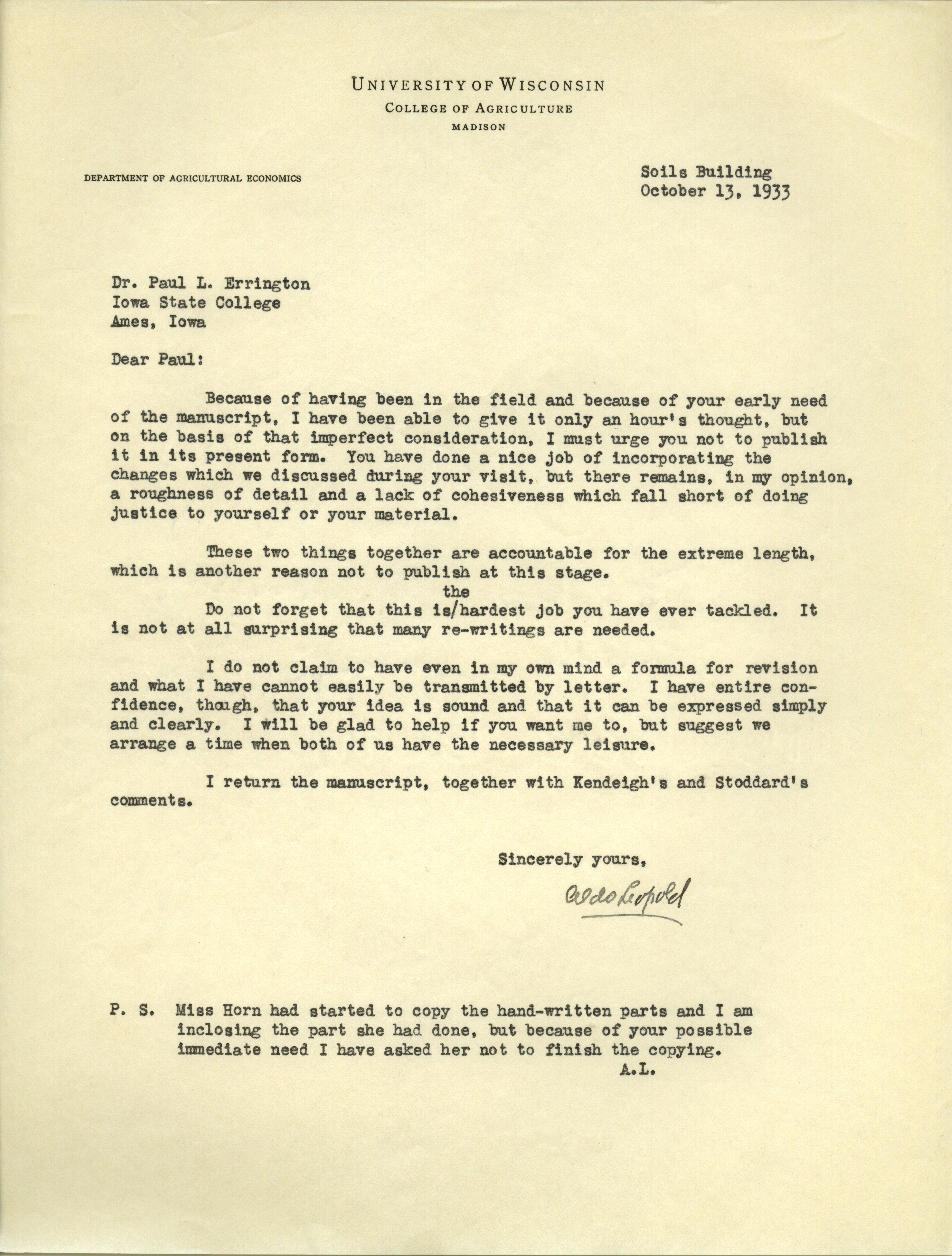 - Aldo Leopold letter to Paul Errington, October 13, 1933