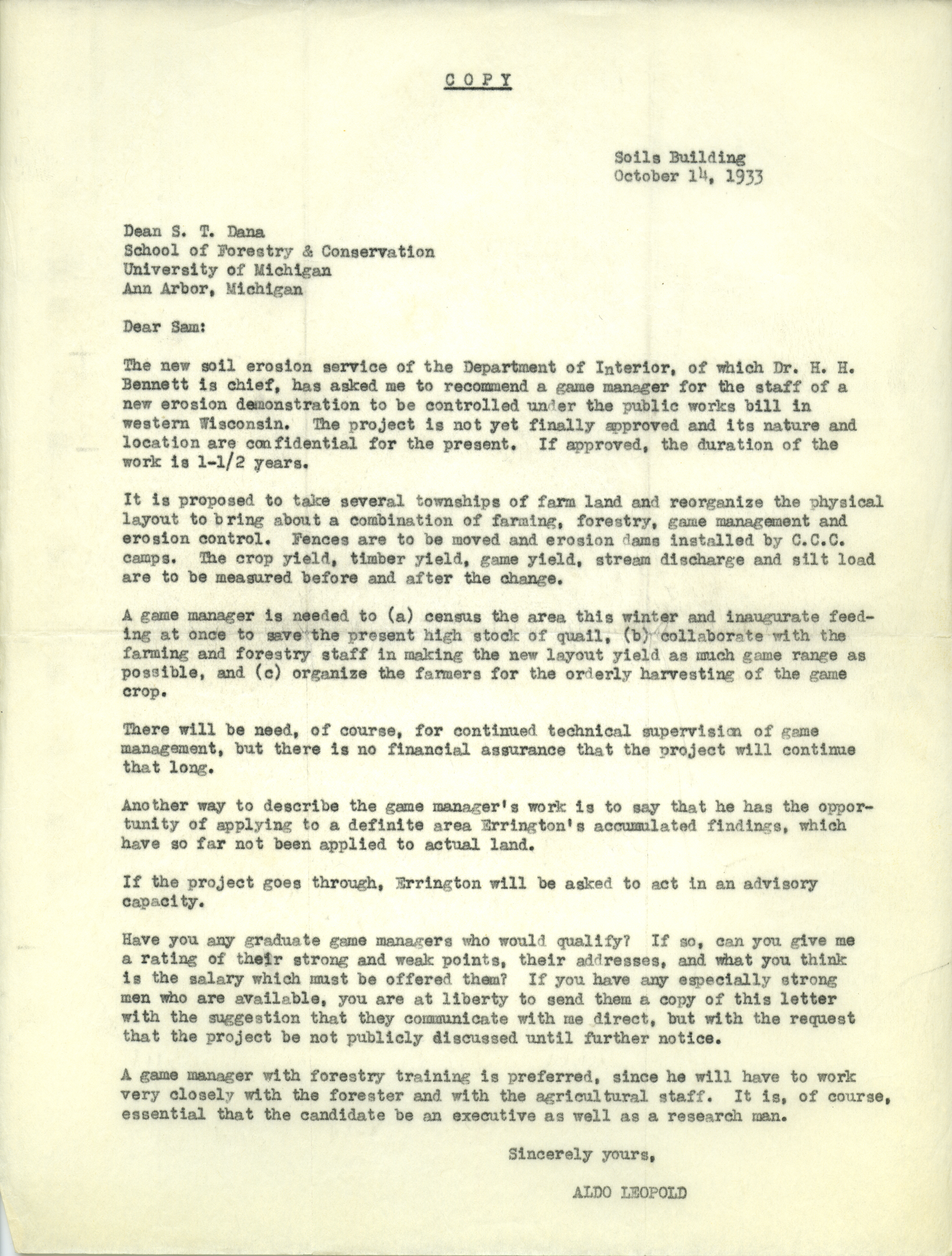 - Aldo Leopold letter to Dana, October 14, 1933