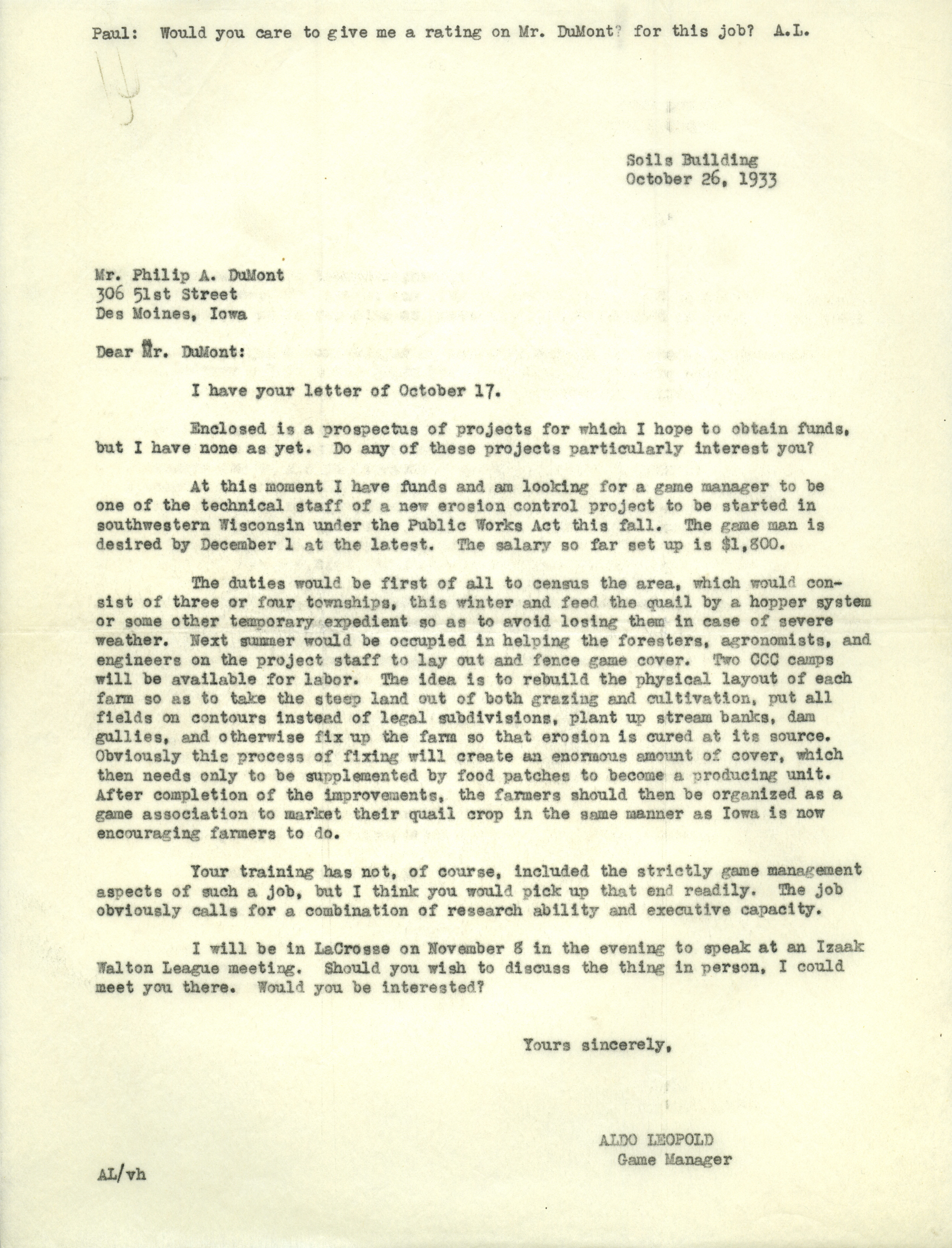 Aldo Leopold letter to DuMont, October 26, 1933 Item Info
