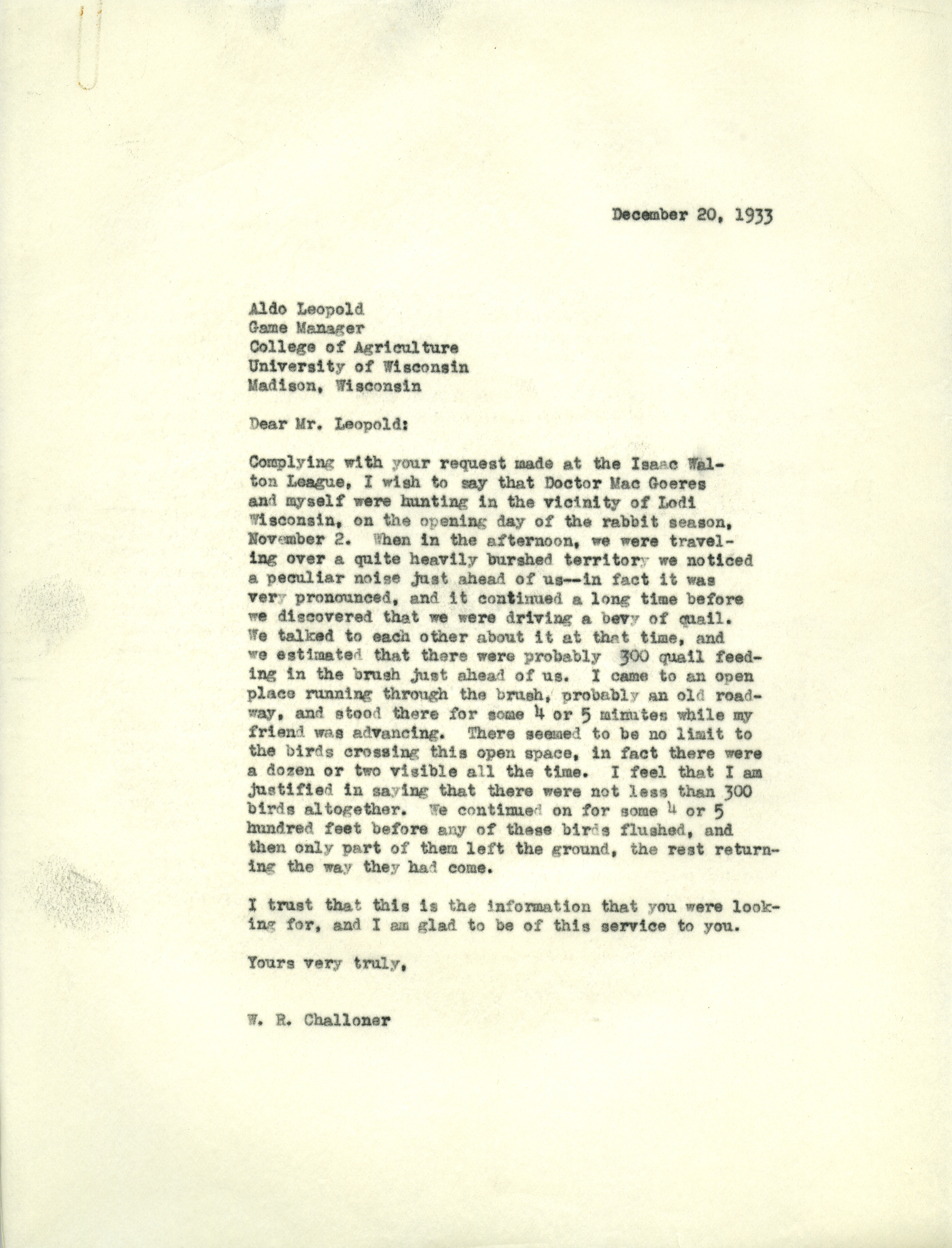 - Letter from Challoner to Aldo Leopold, December 20, 1933