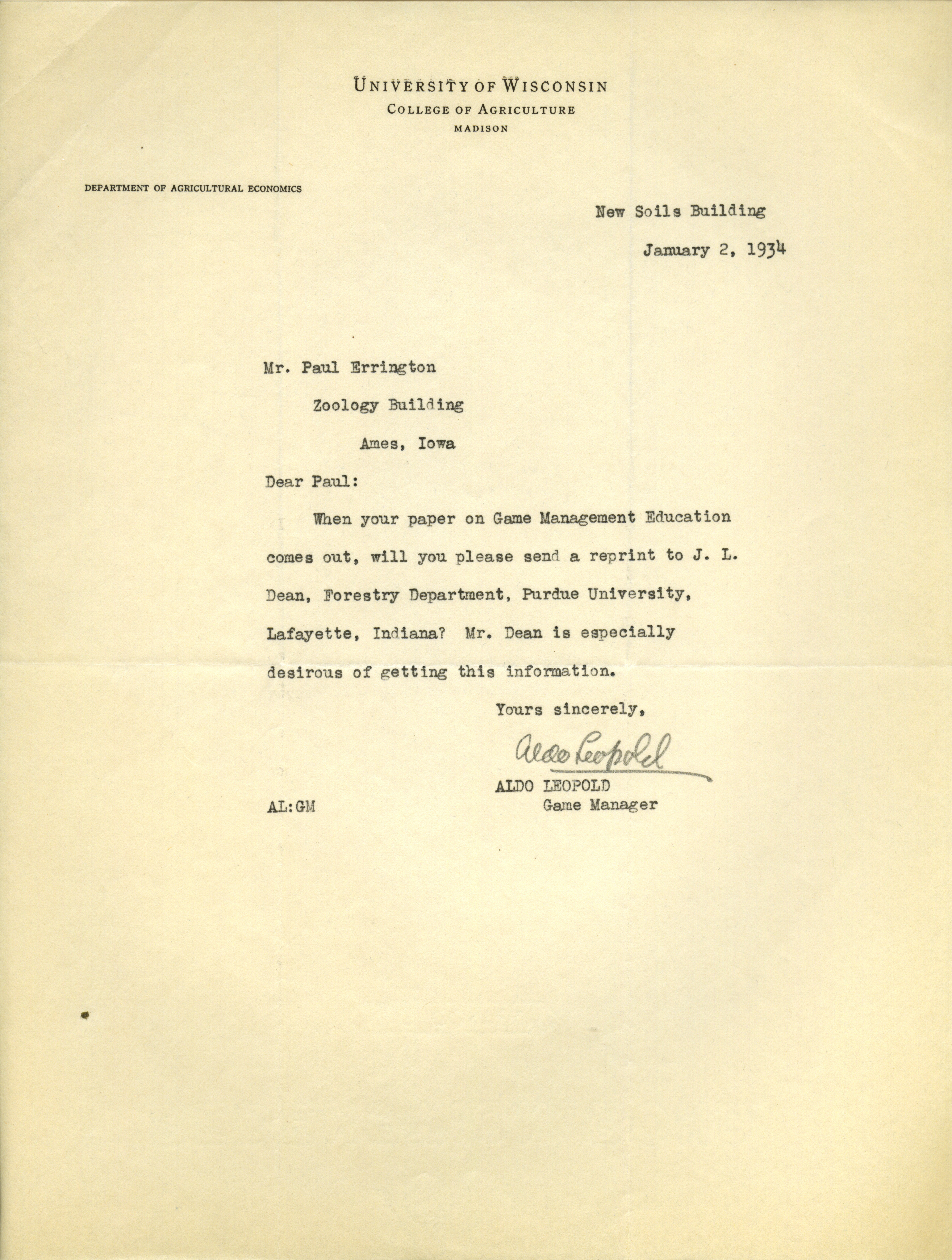 - Aldo Leopold letter to Paul Errington, January 2, 1934