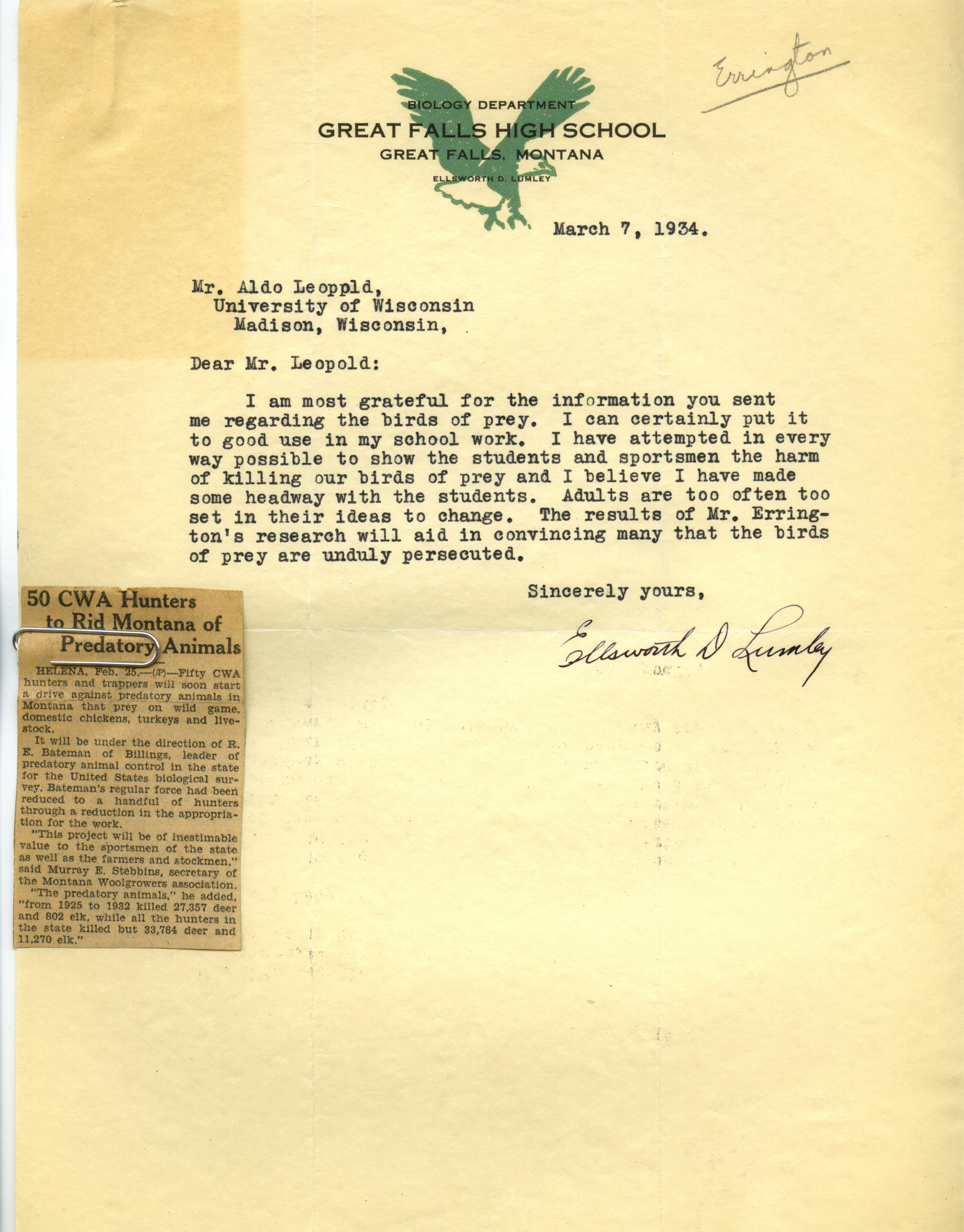 - Letter from Lumley to Aldo Leopold, March 7, 1934