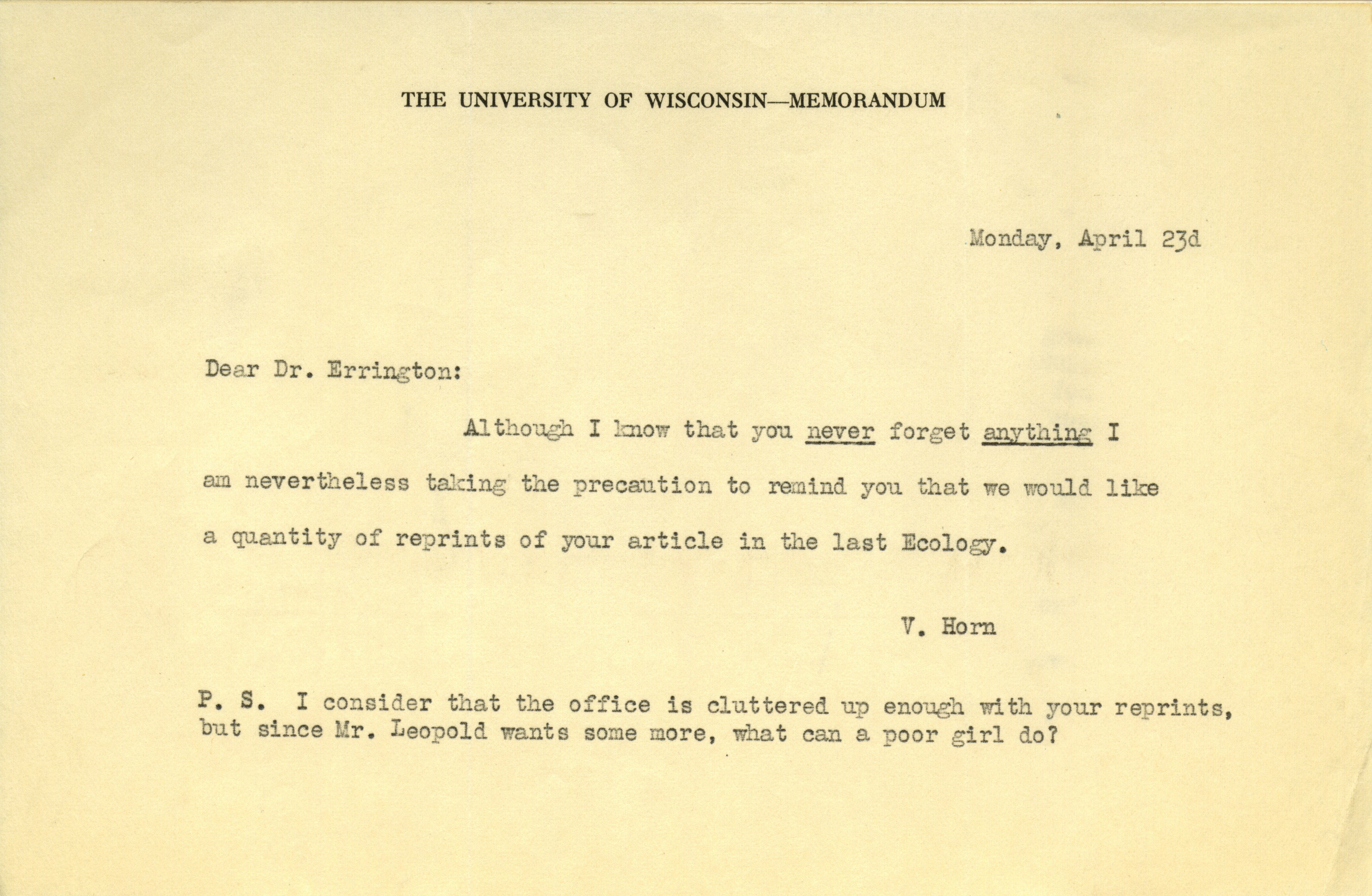 - Aldo Leopold letter to Paul Errington, April 23, 1934