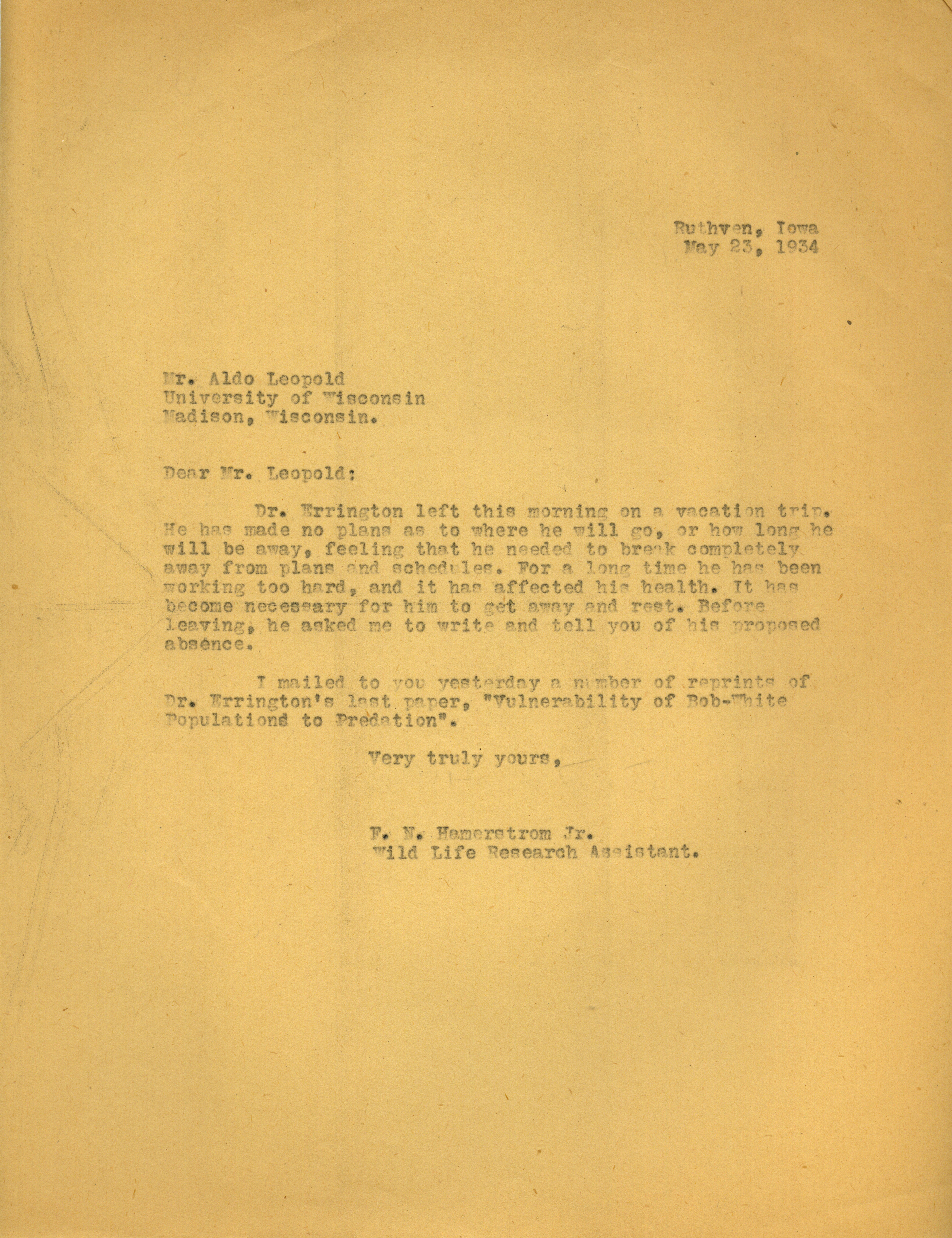 - Letter from Hamerstrom to Aldo Leopold, May 23, 1934
