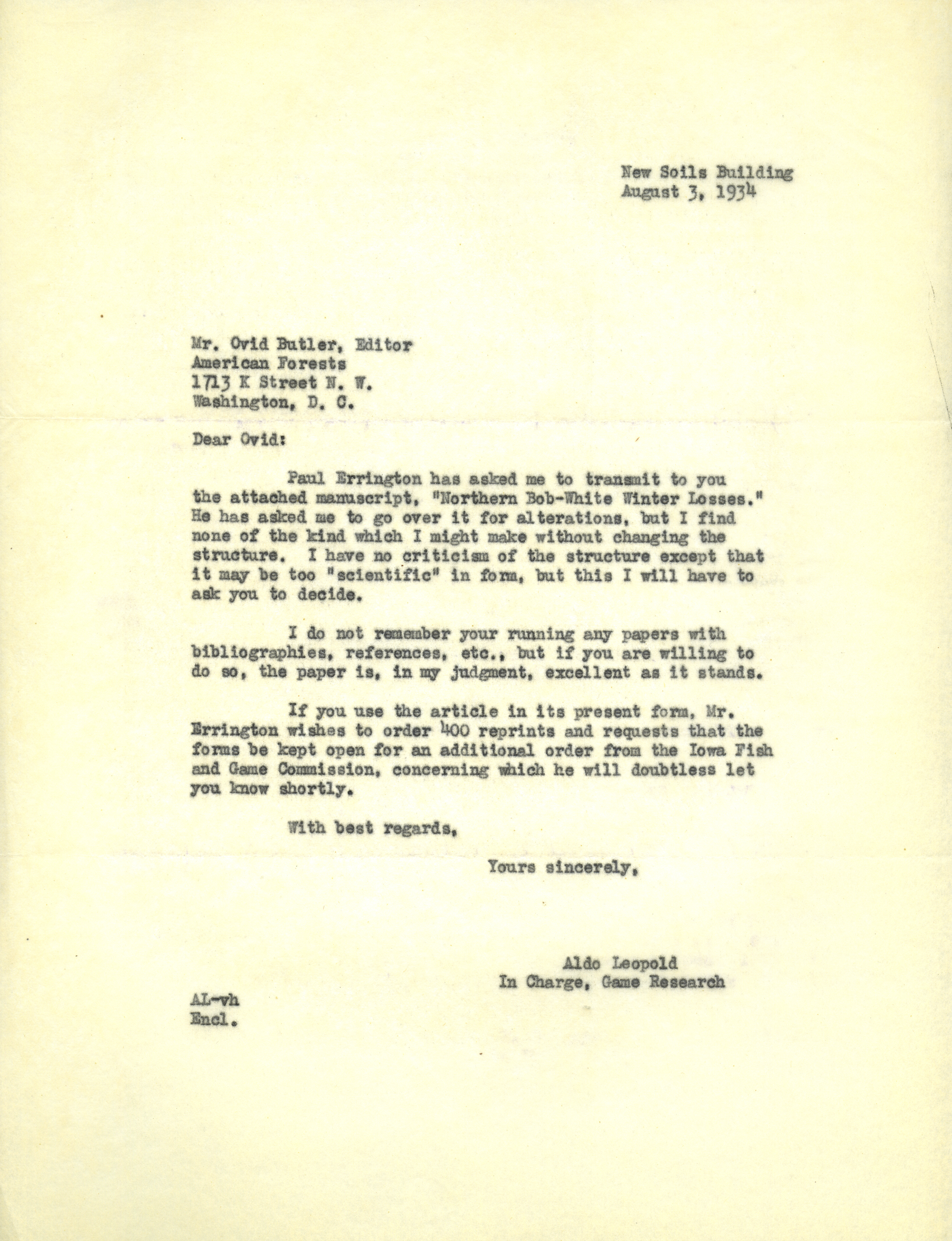 Aldo Leopold letter to Butler, August 3, 1934 Item Info