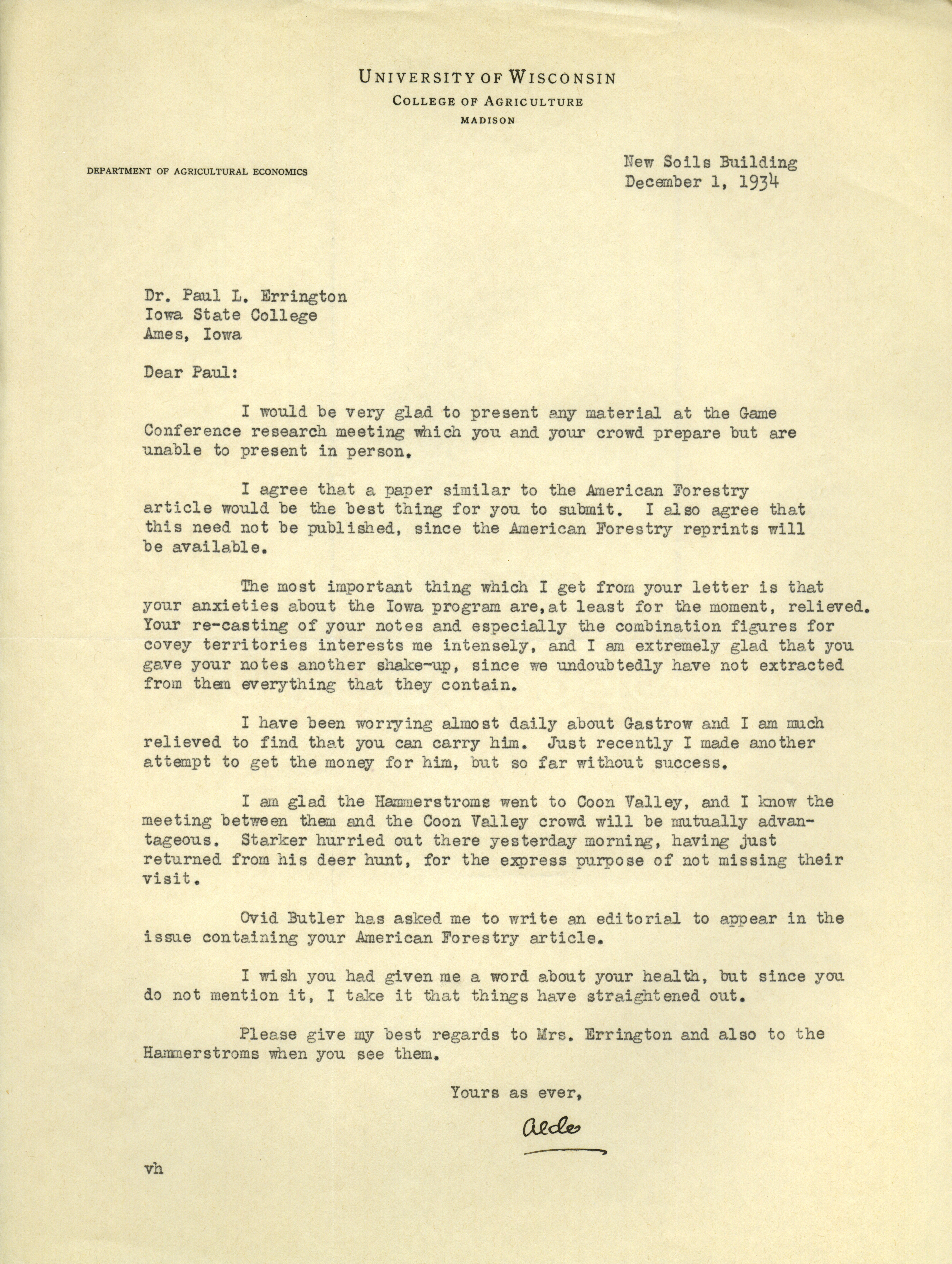- Aldo Leopold letter to Paul Errington, December 1, 1934
