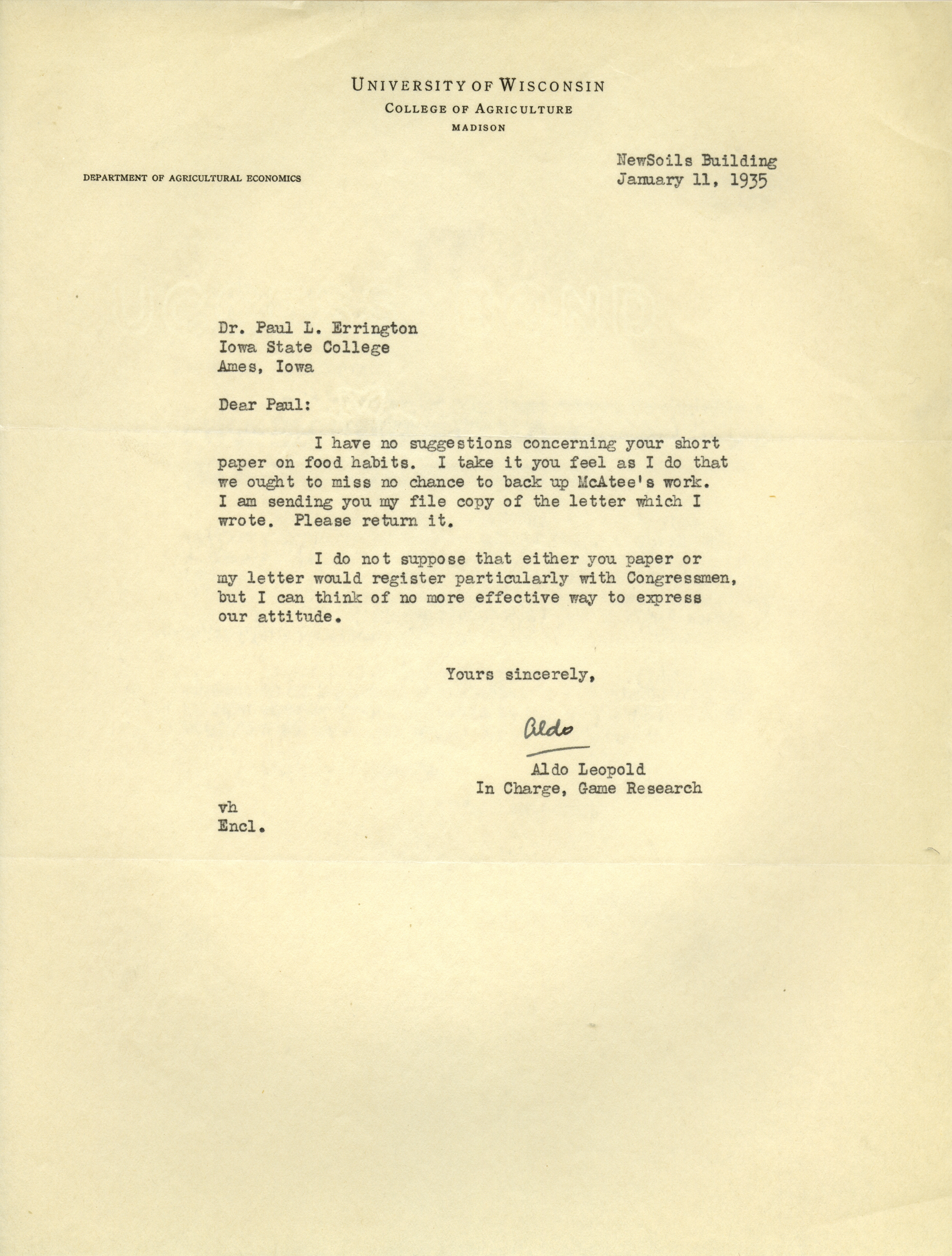 - Aldo Leopold letter to Paul Errington, January 11, 1935