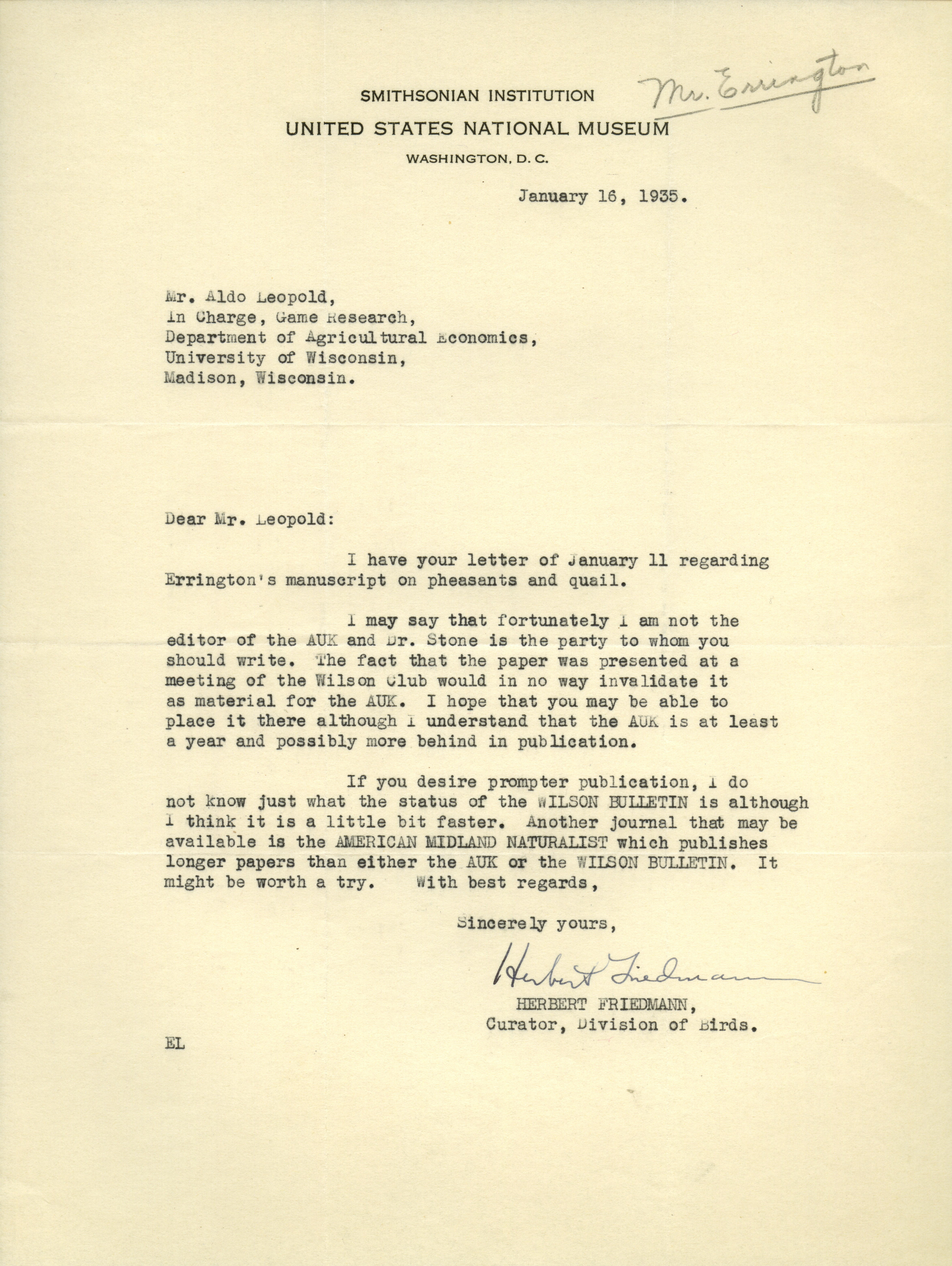 - Letter from Friedmann to Aldo Leopold, January 16, 1935