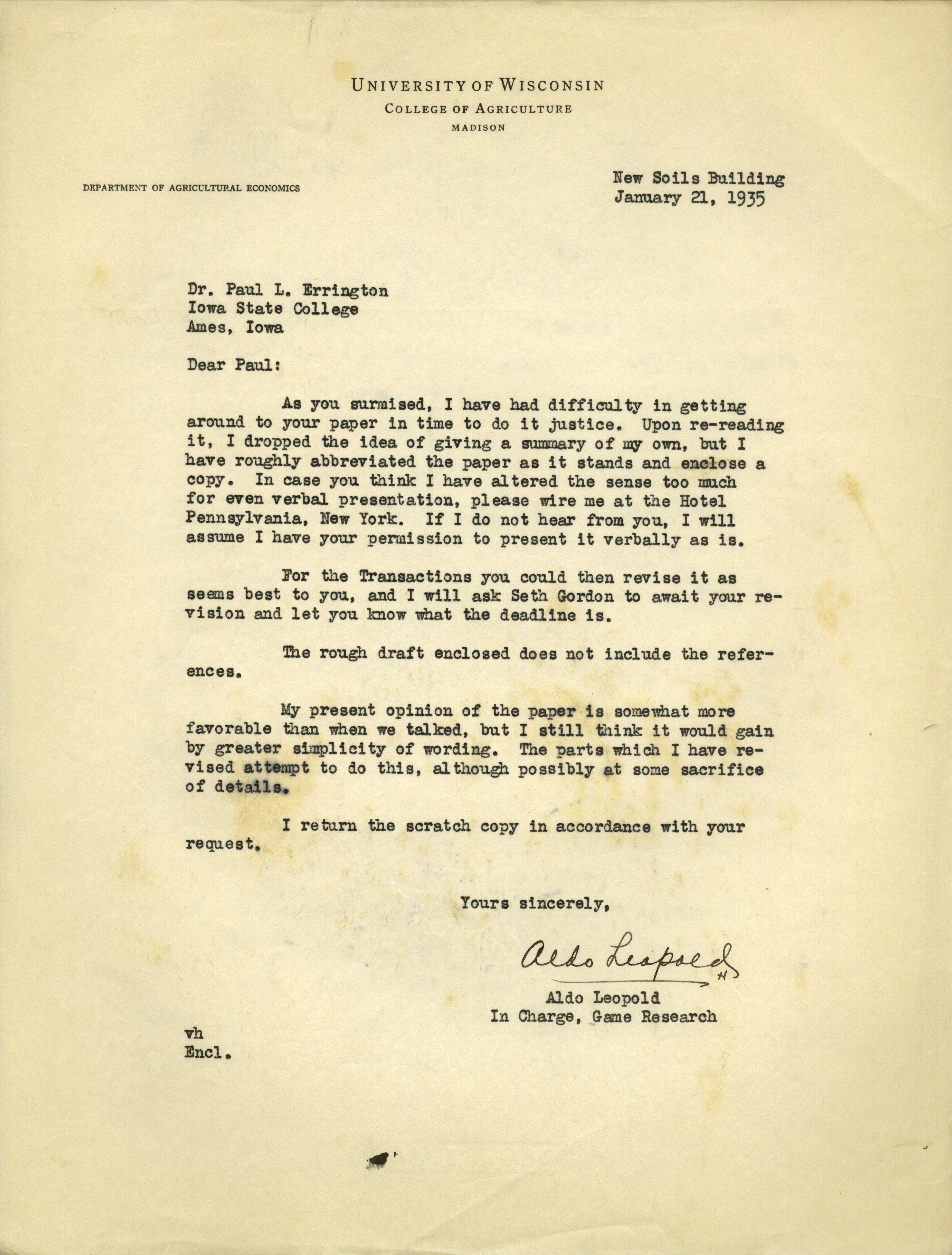 - Aldo Leopold letter to Paul Errington, January 21, 1935