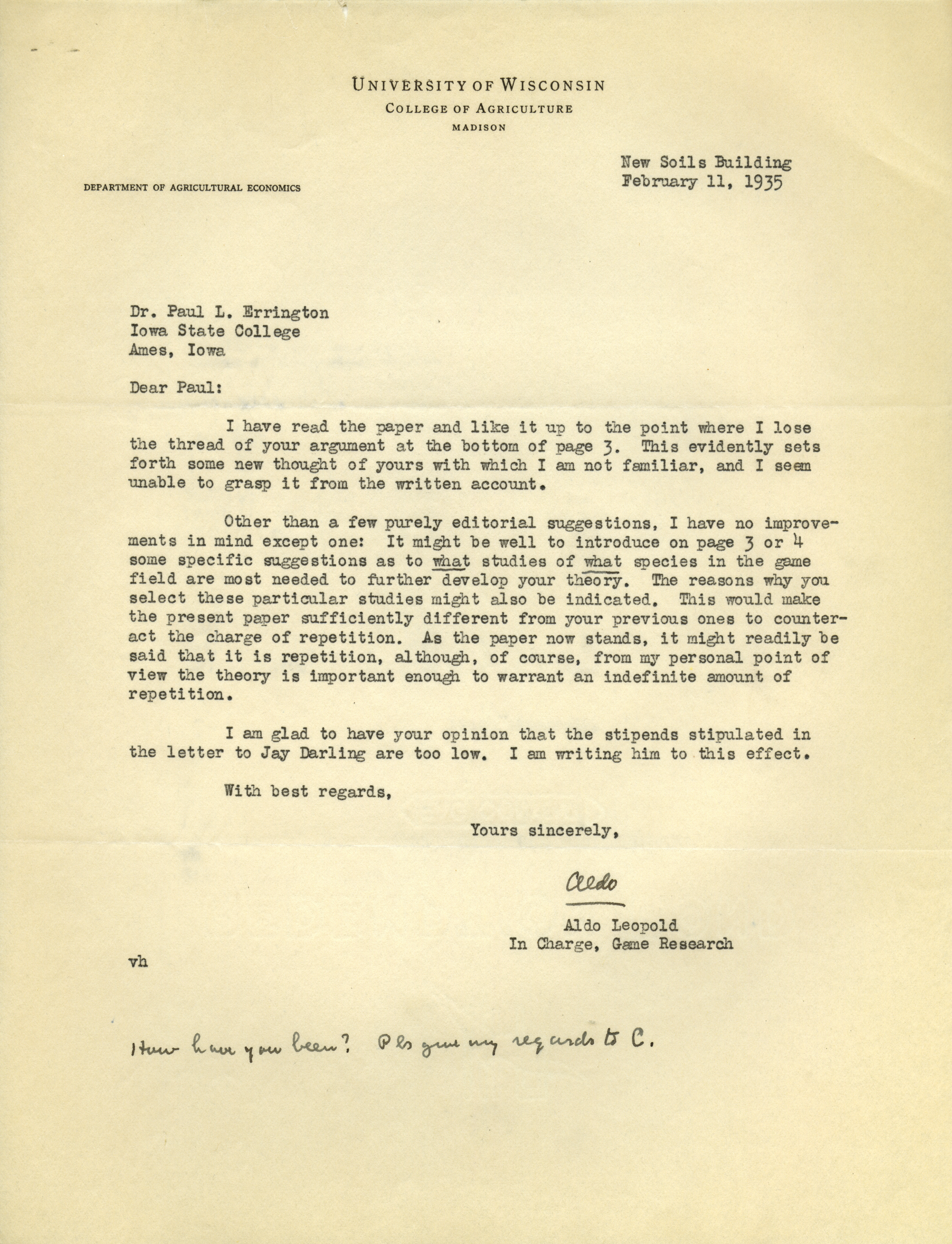 - Aldo Leopold letter to Paul Errington, February 11, 1935
