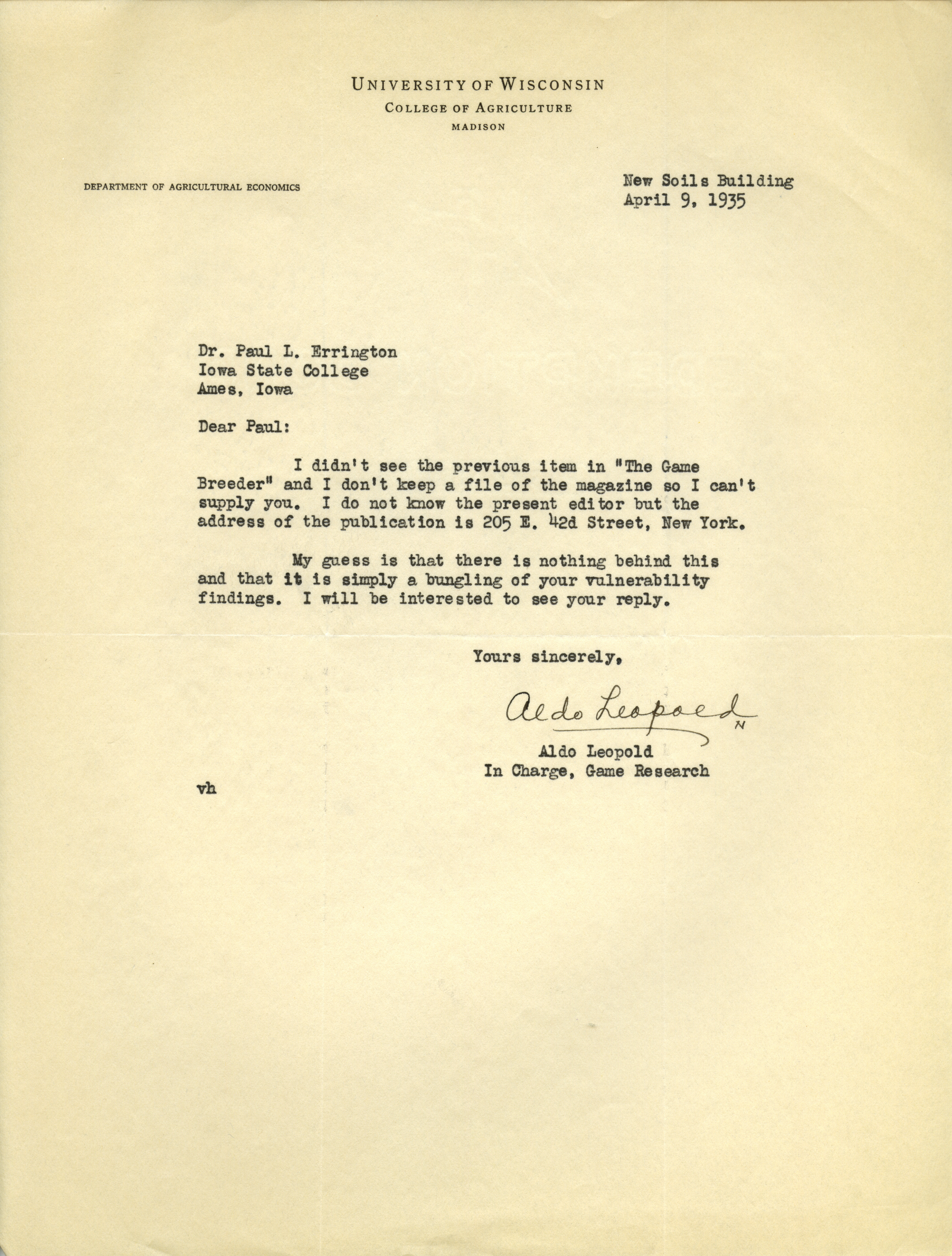 Aldo Leopold letter to Paul Errington, April 9, 1935 Item Info