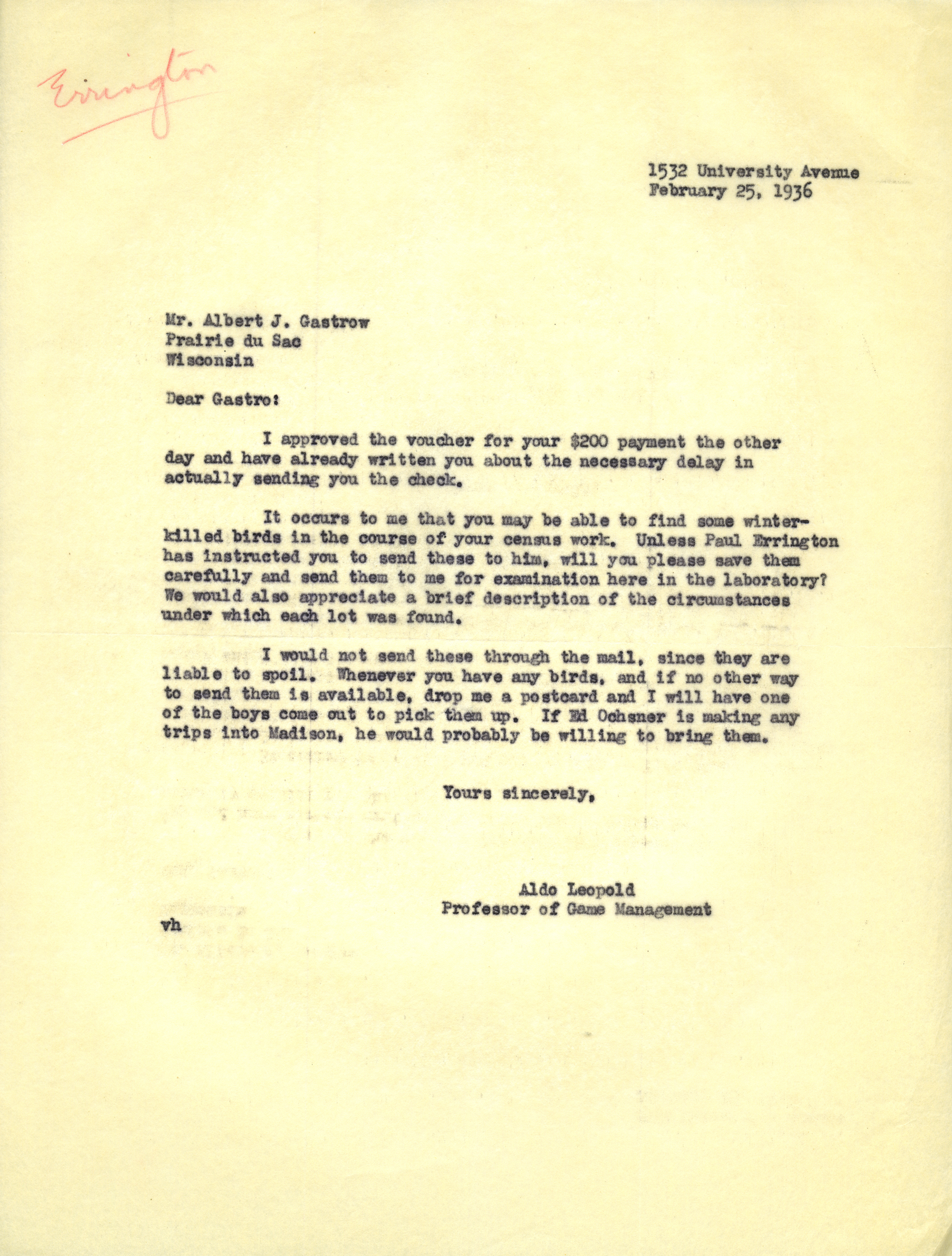 Aldo Leopold letter to Gastrow, February 25, 1936 Item Info