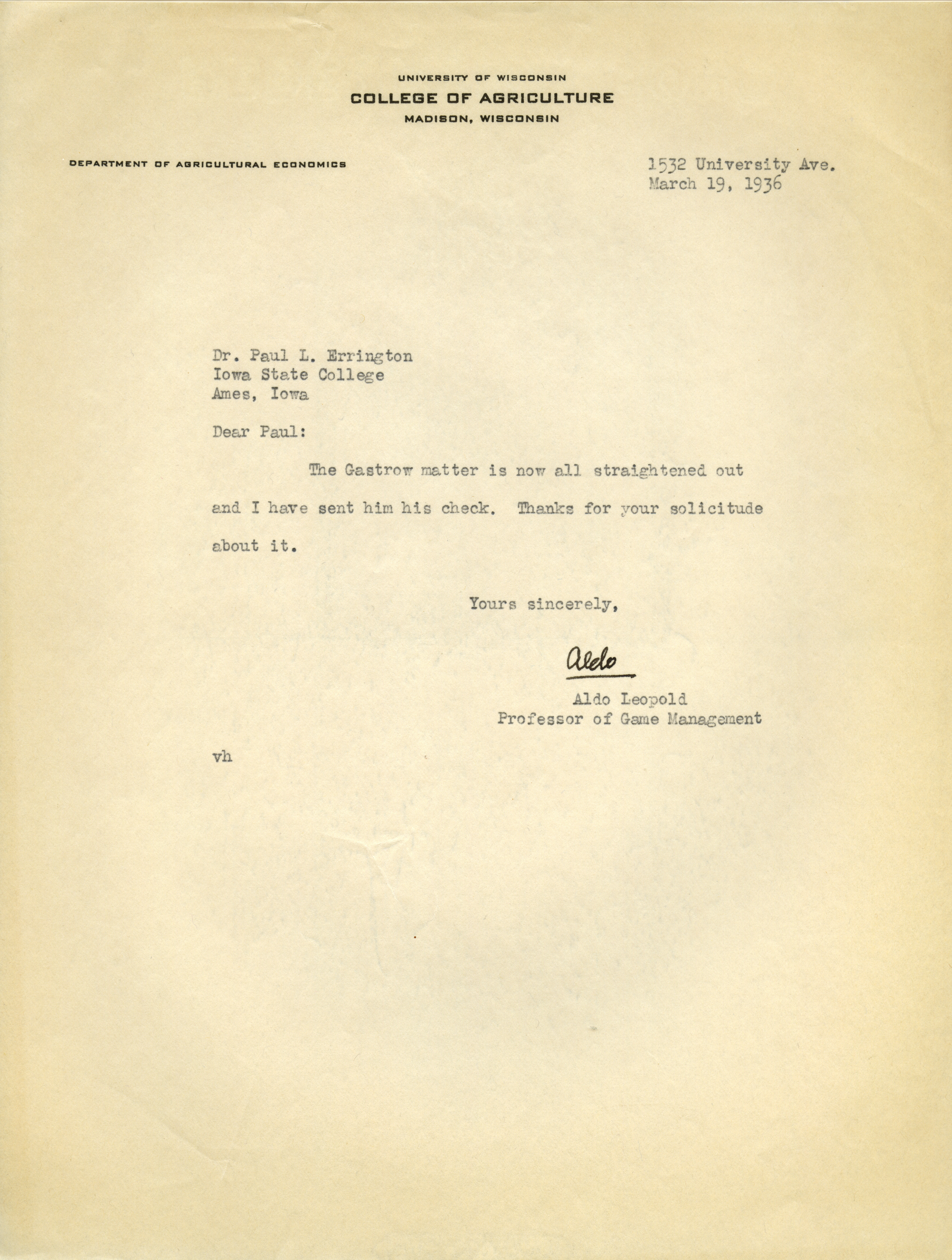 Aldo Leopold letter to Paul Errington, March 19, 1936 Item Info
