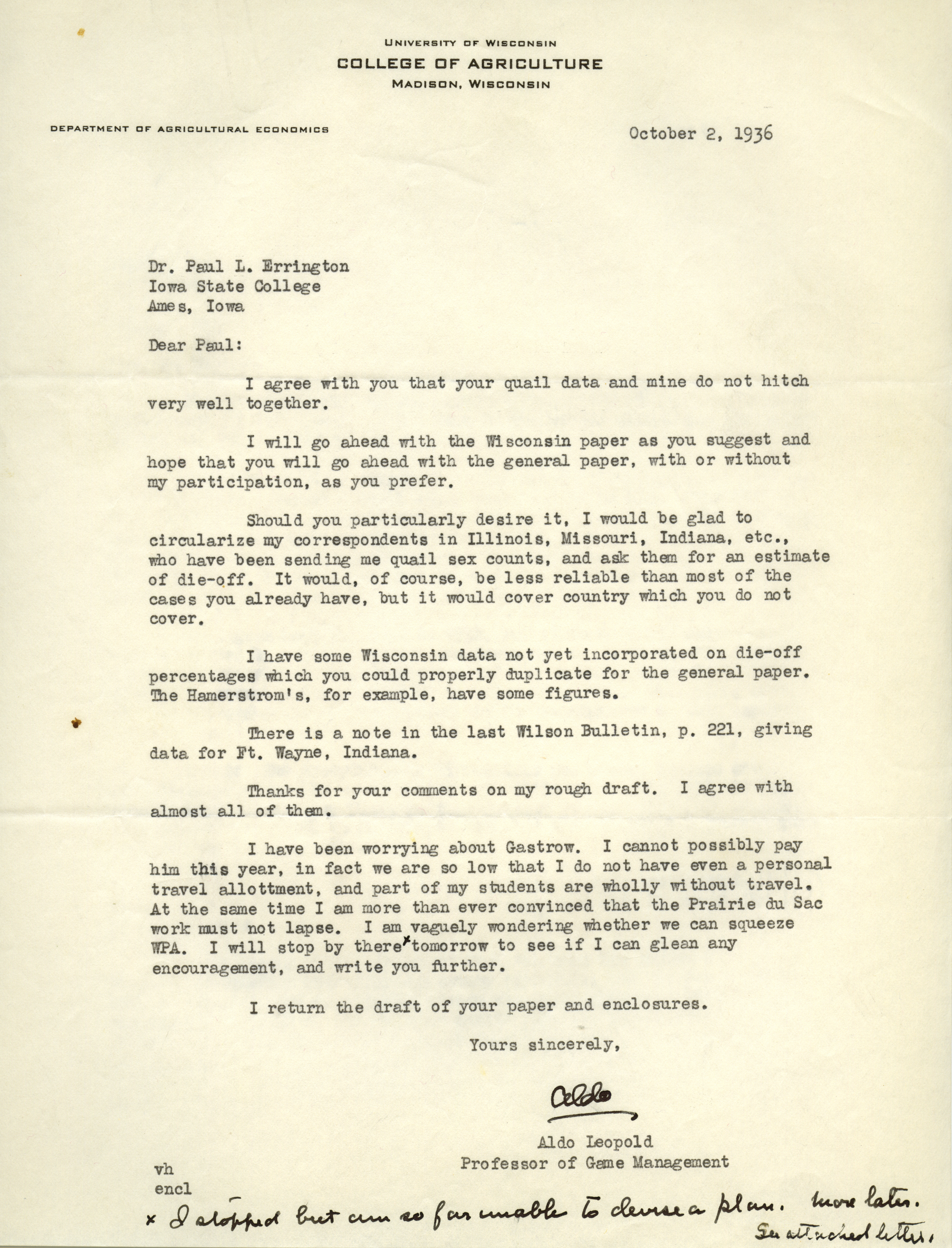 - Aldo Leopold letter to Paul Errington, October 2, 1936