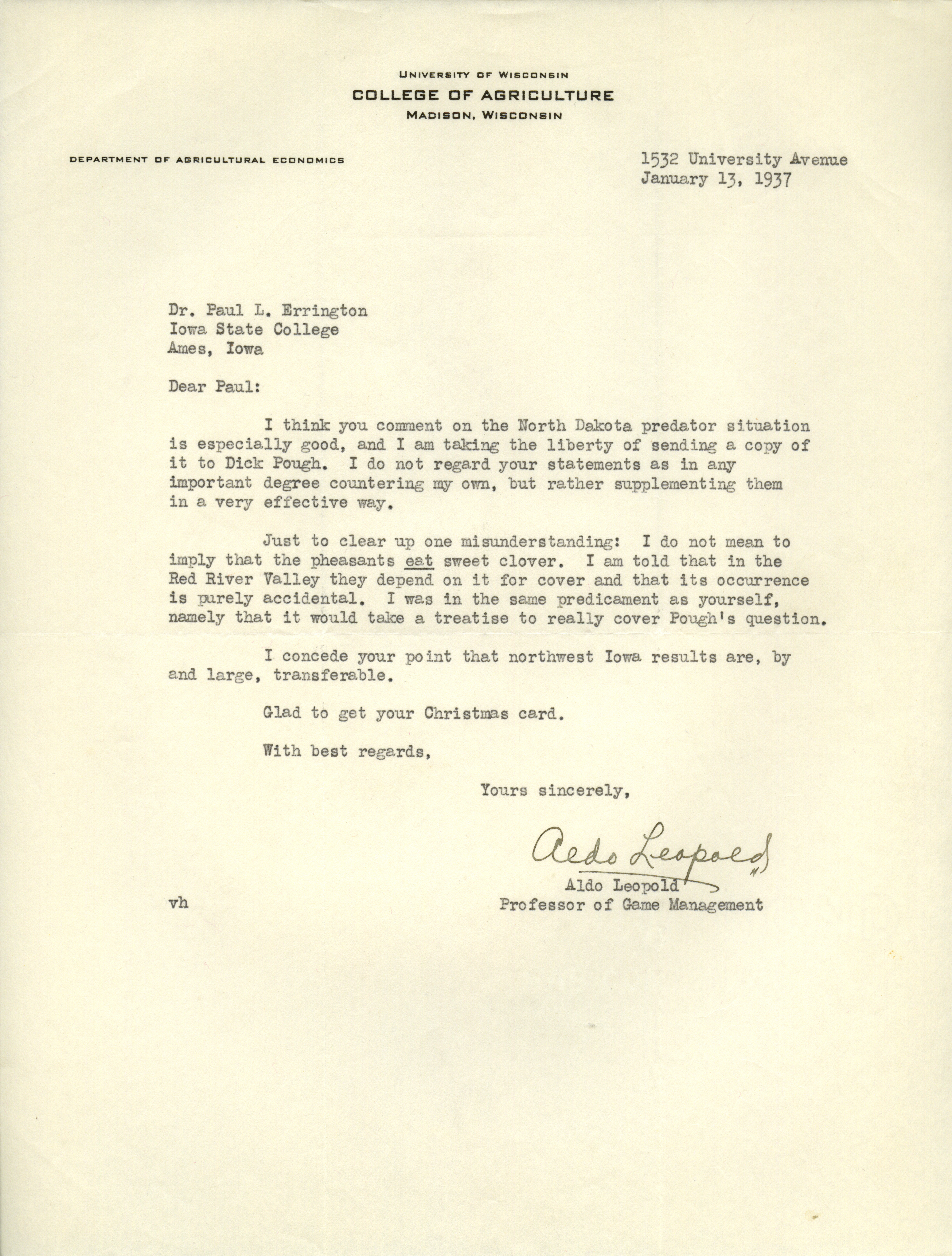 - Aldo Leopold letter to Paul Errington, January 13, 1937