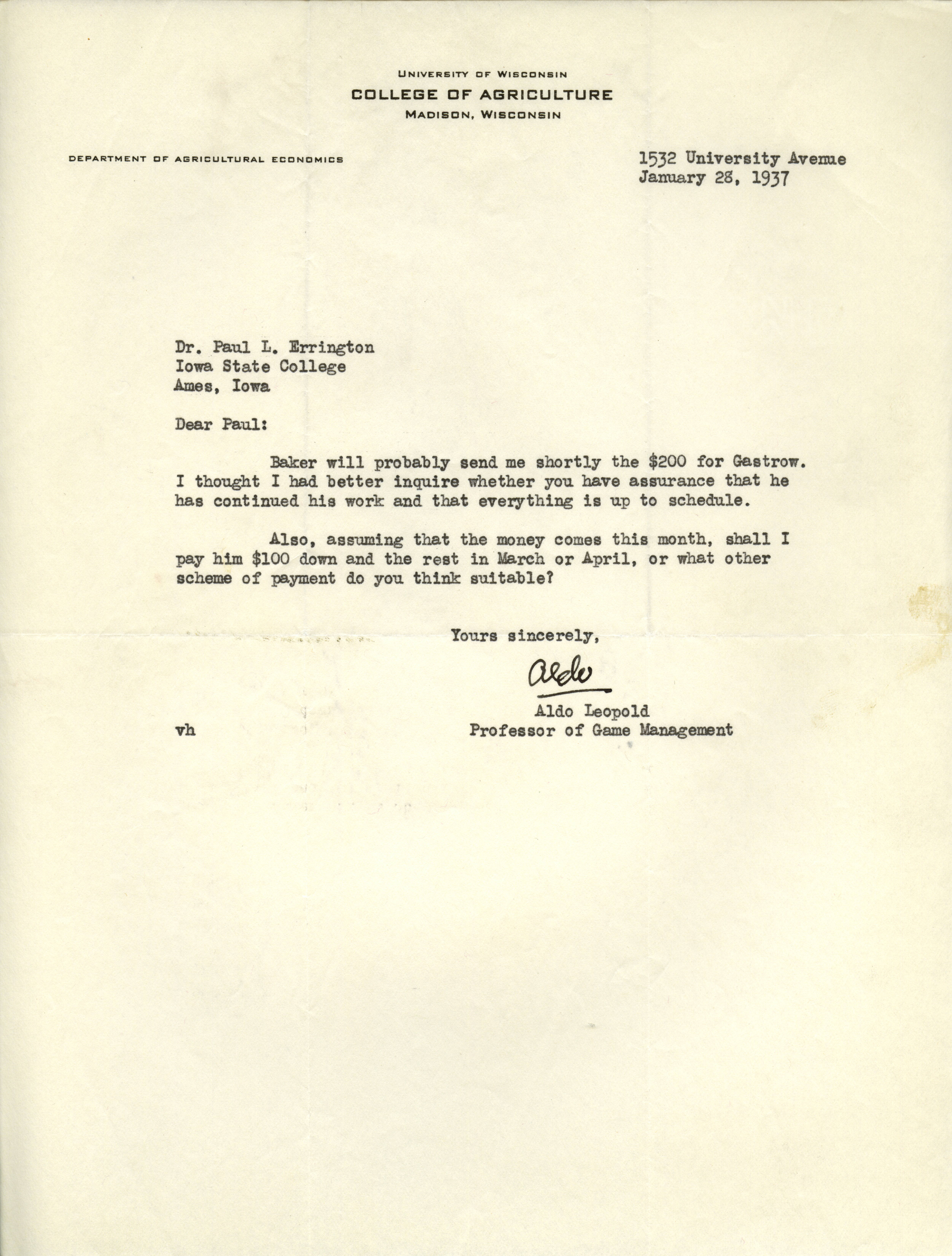 Aldo Leopold letter to Paul Errington, January 28, 1937 Item Info
