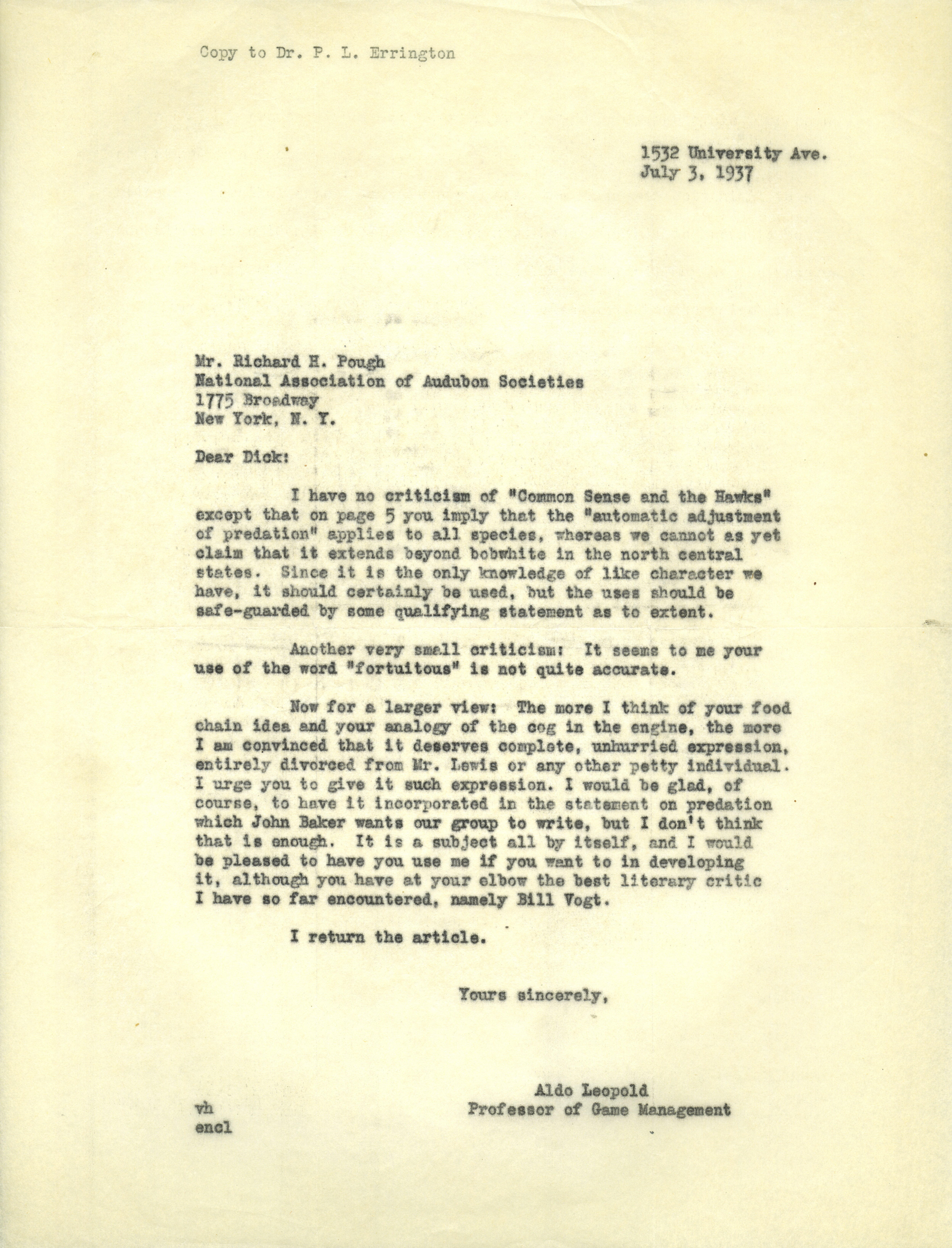 - Aldo Leopold letter to Pough, July 3, 1937