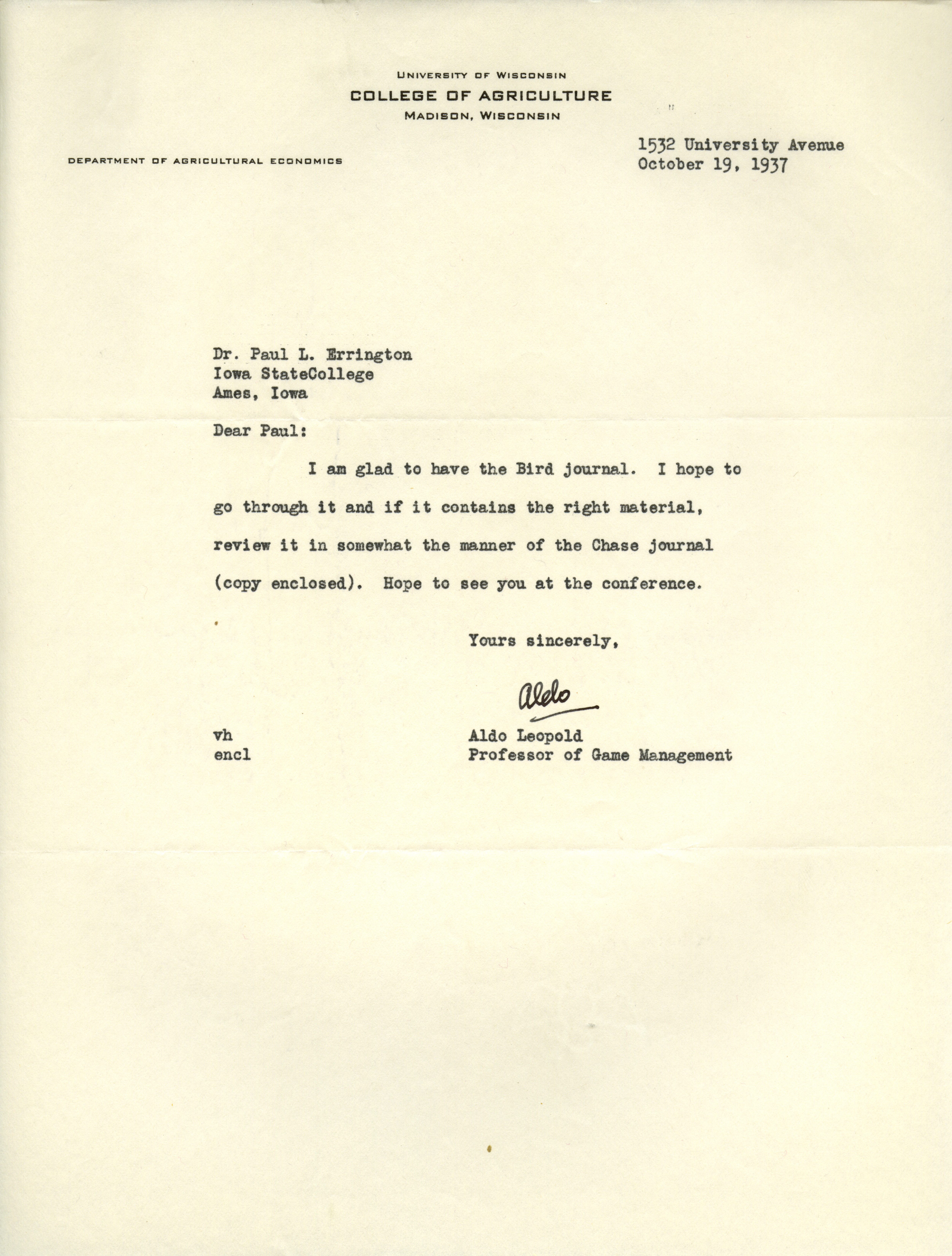 - Aldo Leopold letter to Paul Errington, October 19, 1937