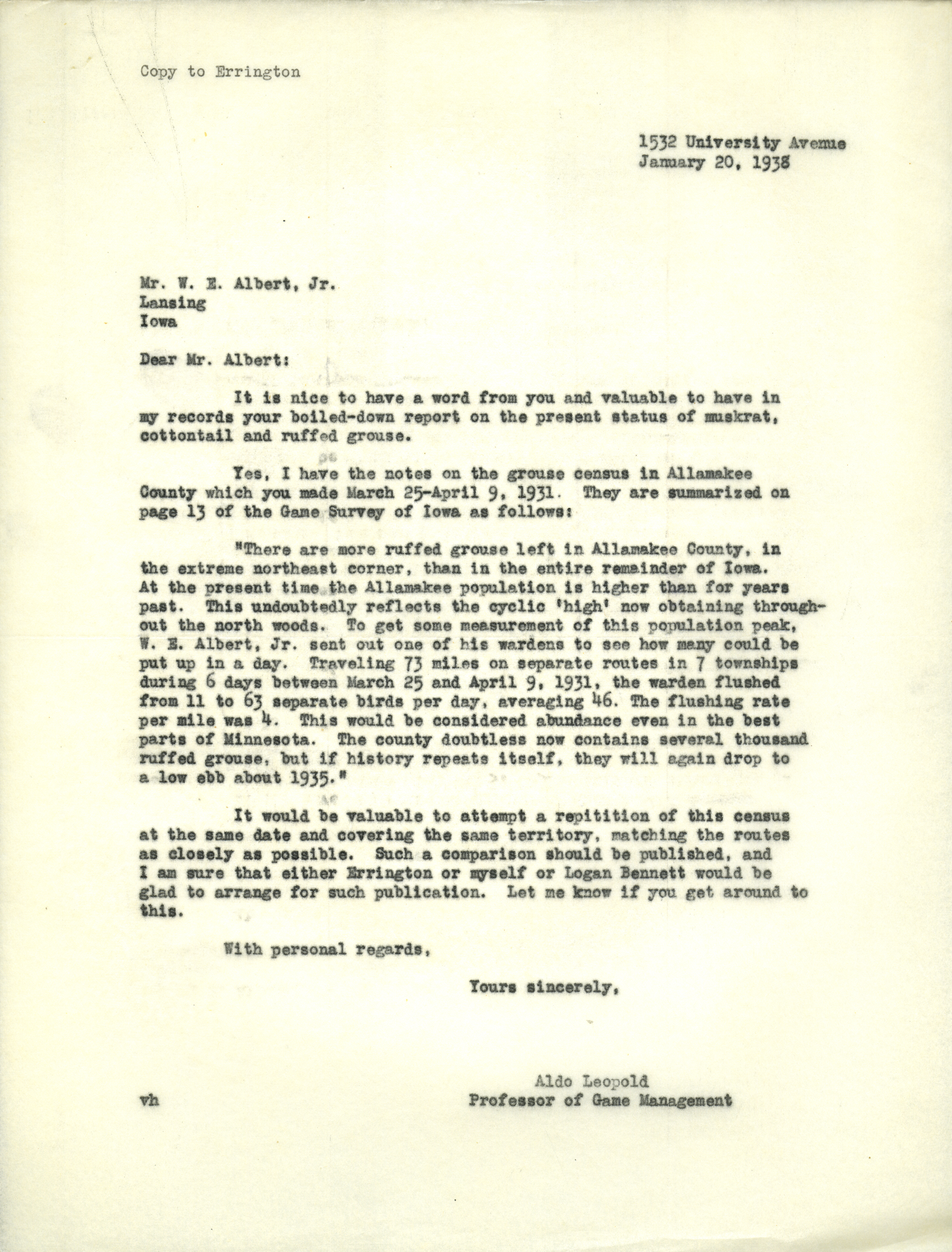 - "Aldo Leopold letter to Albert, January 20, 1938", Paul L. Errington Collection, Iowa State University Library Digital Collections