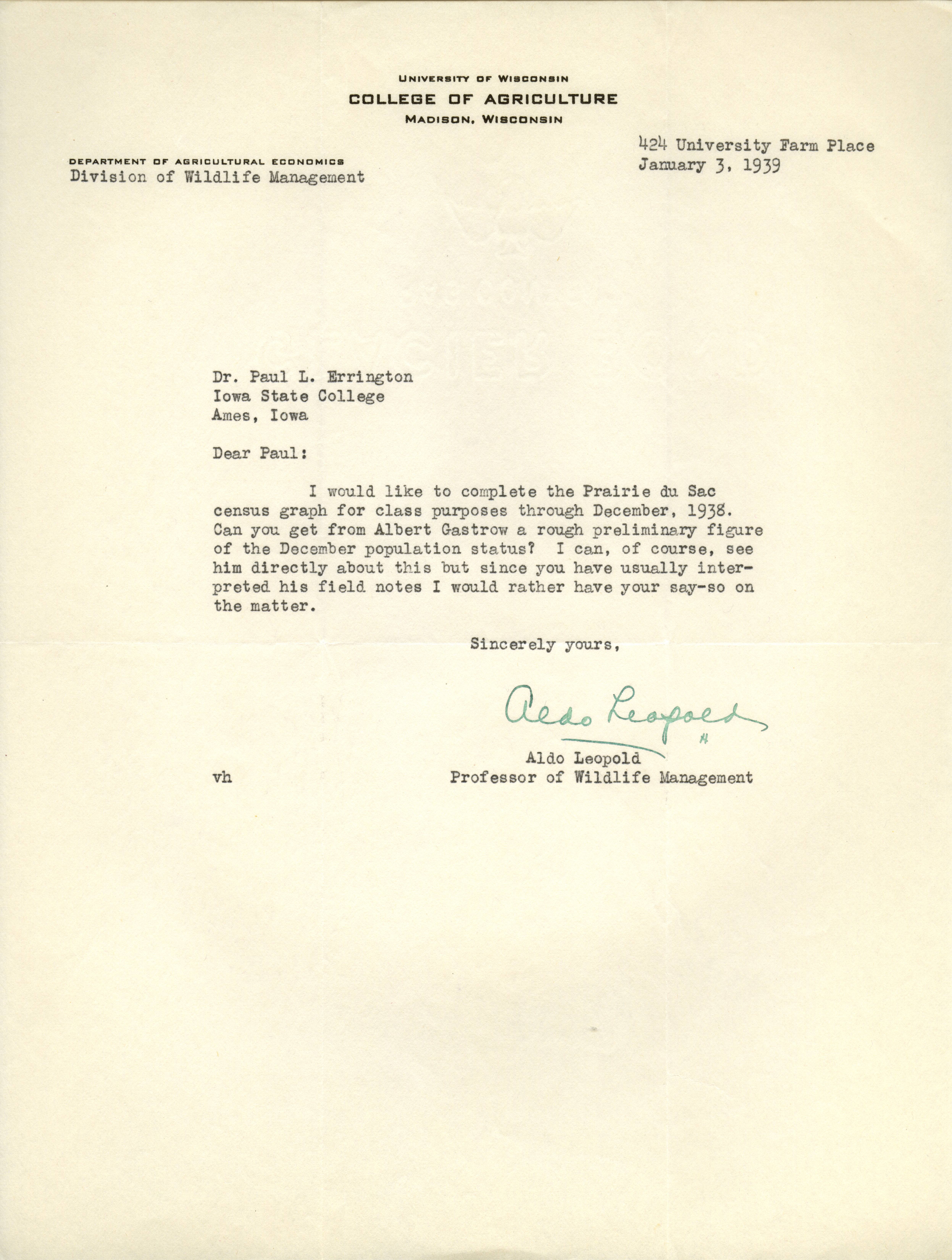 - Aldo Leopold letter to Paul Errington, January 3, 1939