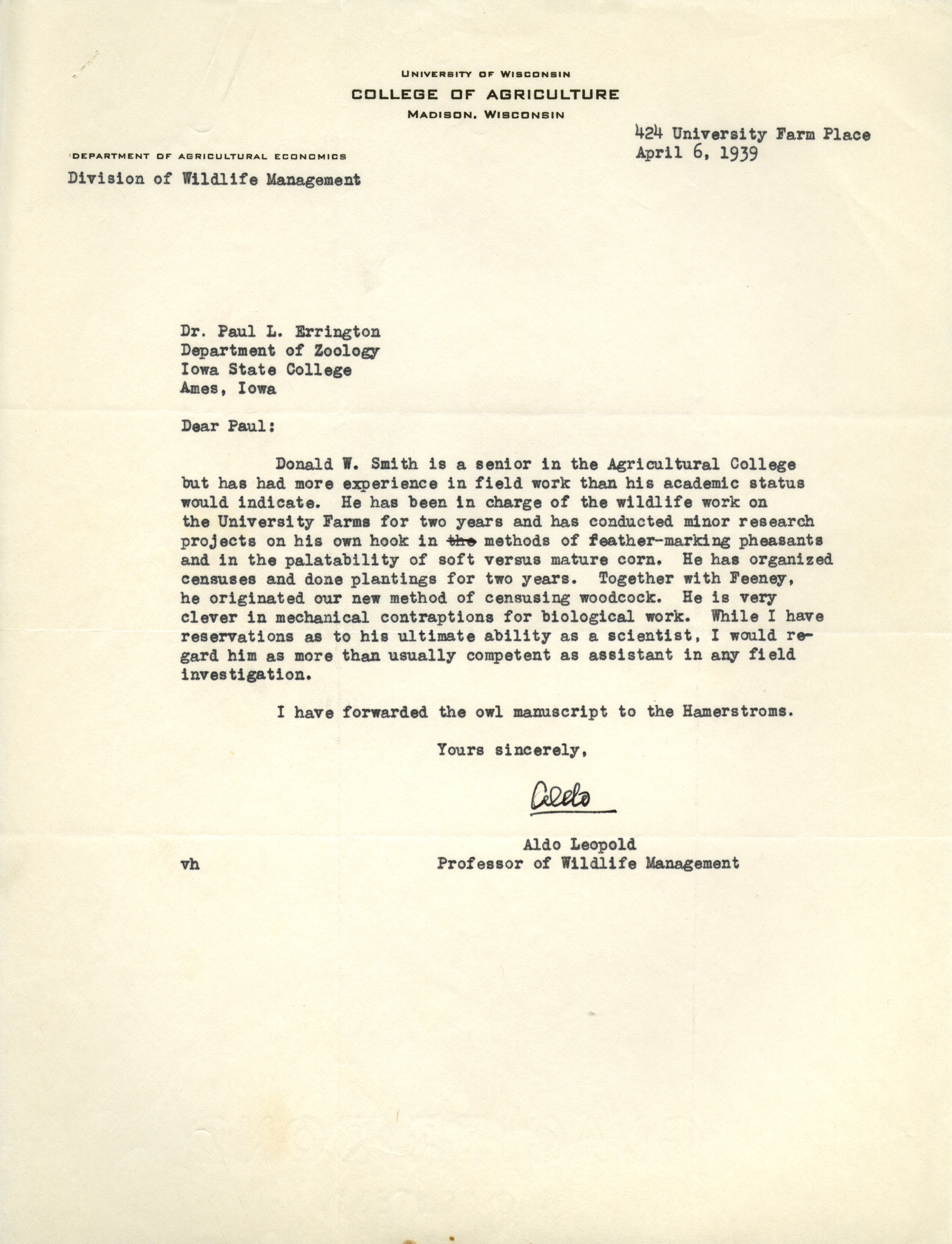- Aldo Leopold letter to Paul Errington, April 6, 1939