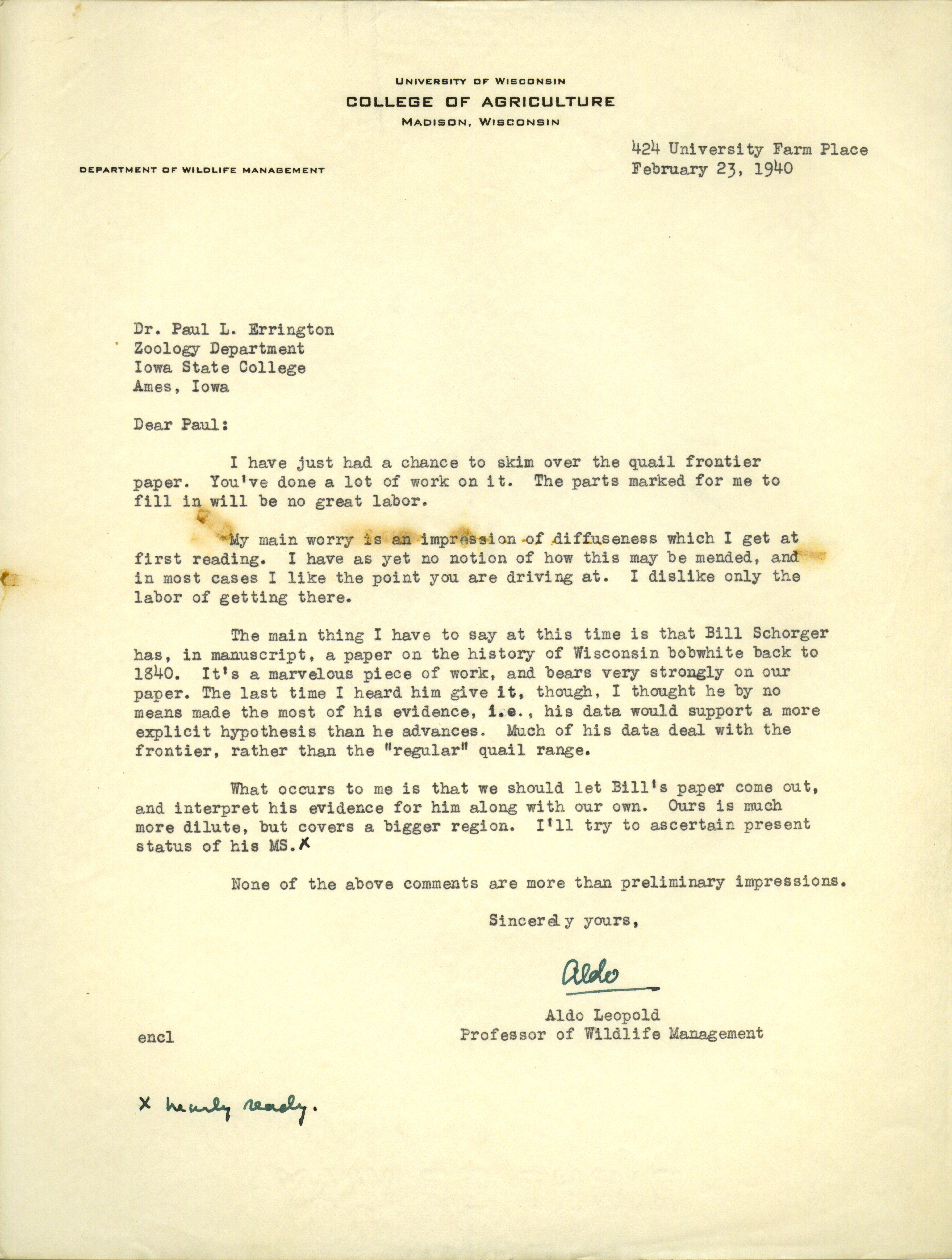 - Aldo Leopold letter to Paul Errington, February 23, 1940