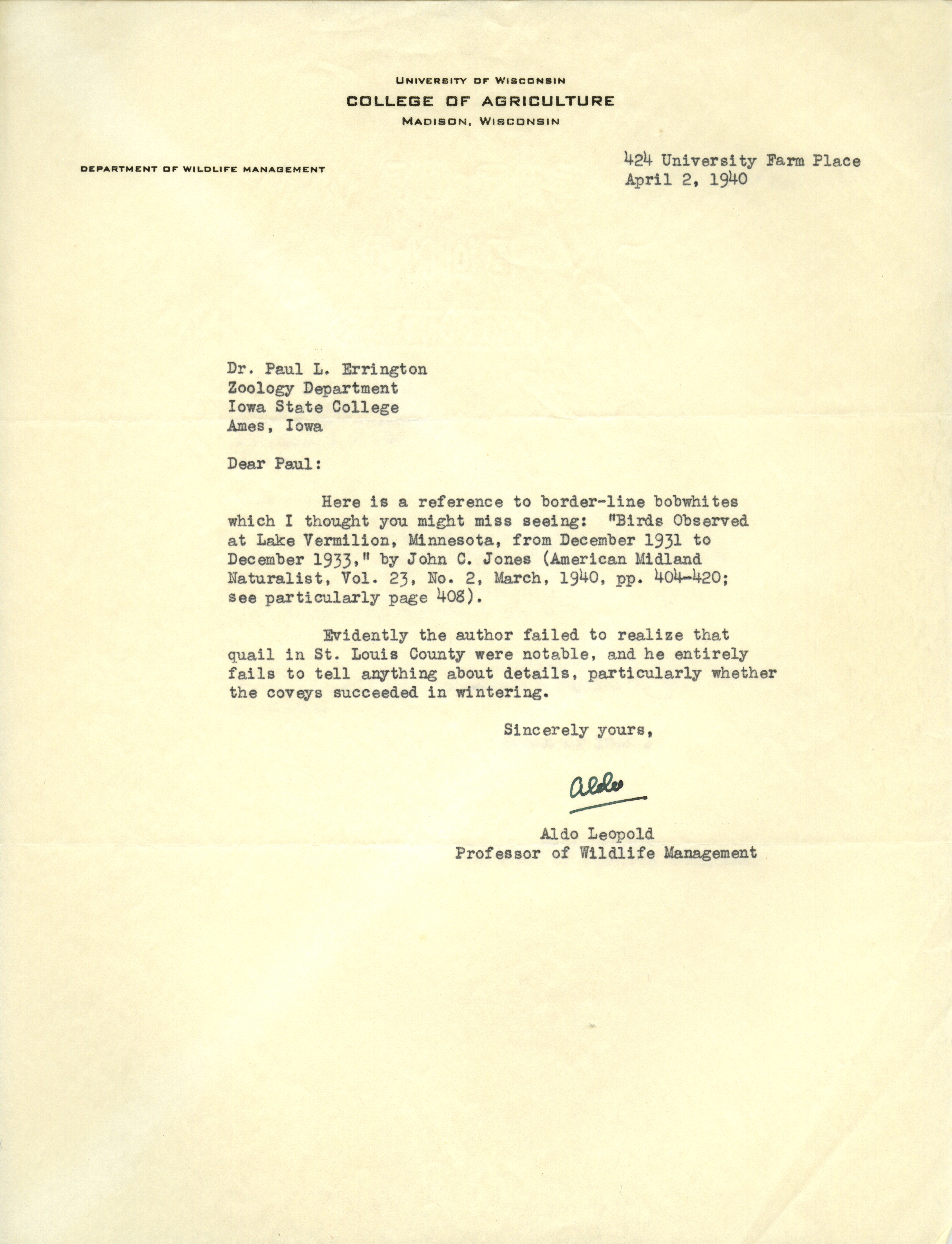 - Aldo Leopold letter to Paul Errington, April 2, 1940
