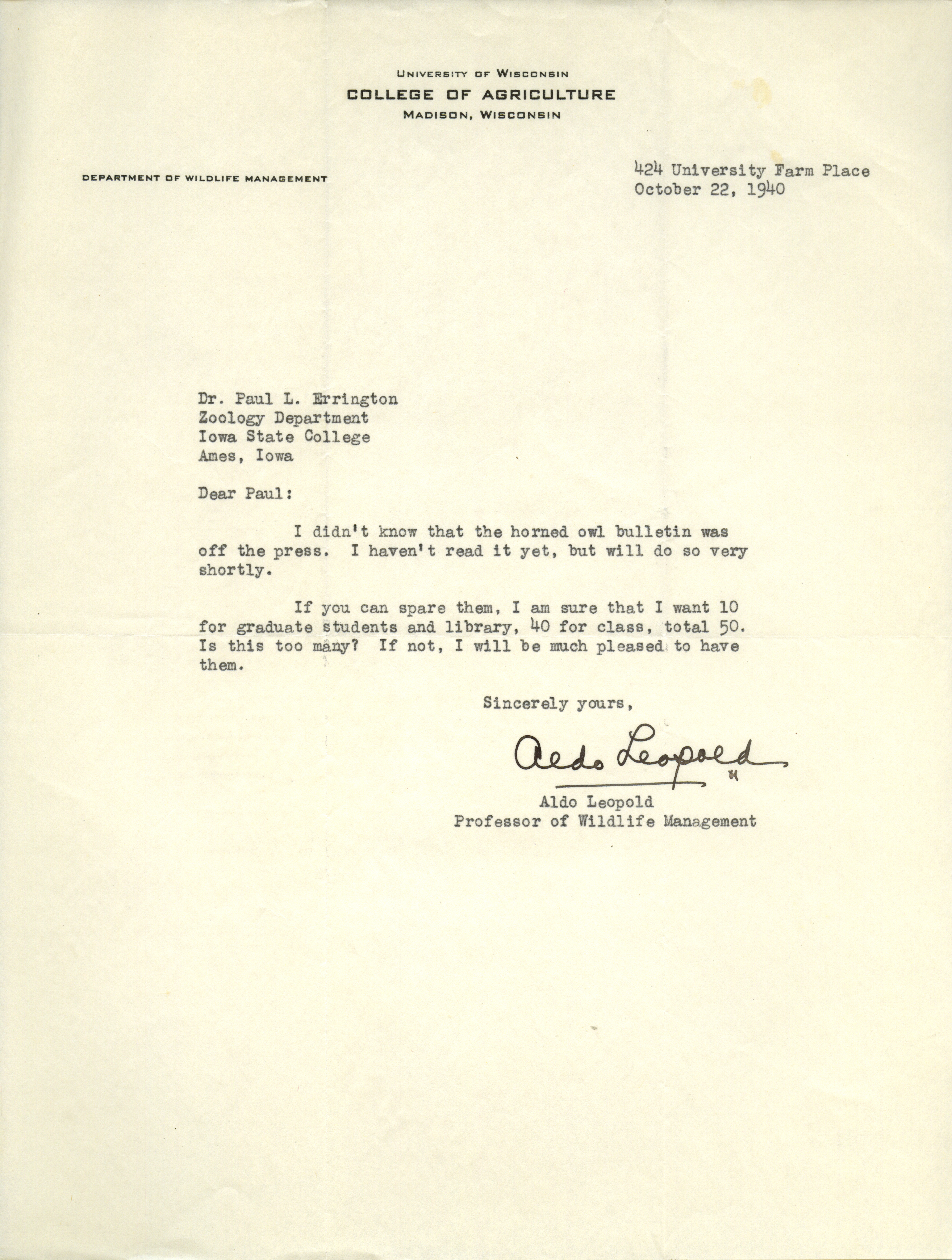 - Aldo Leopold letter to Paul Errington, October 22, 1940