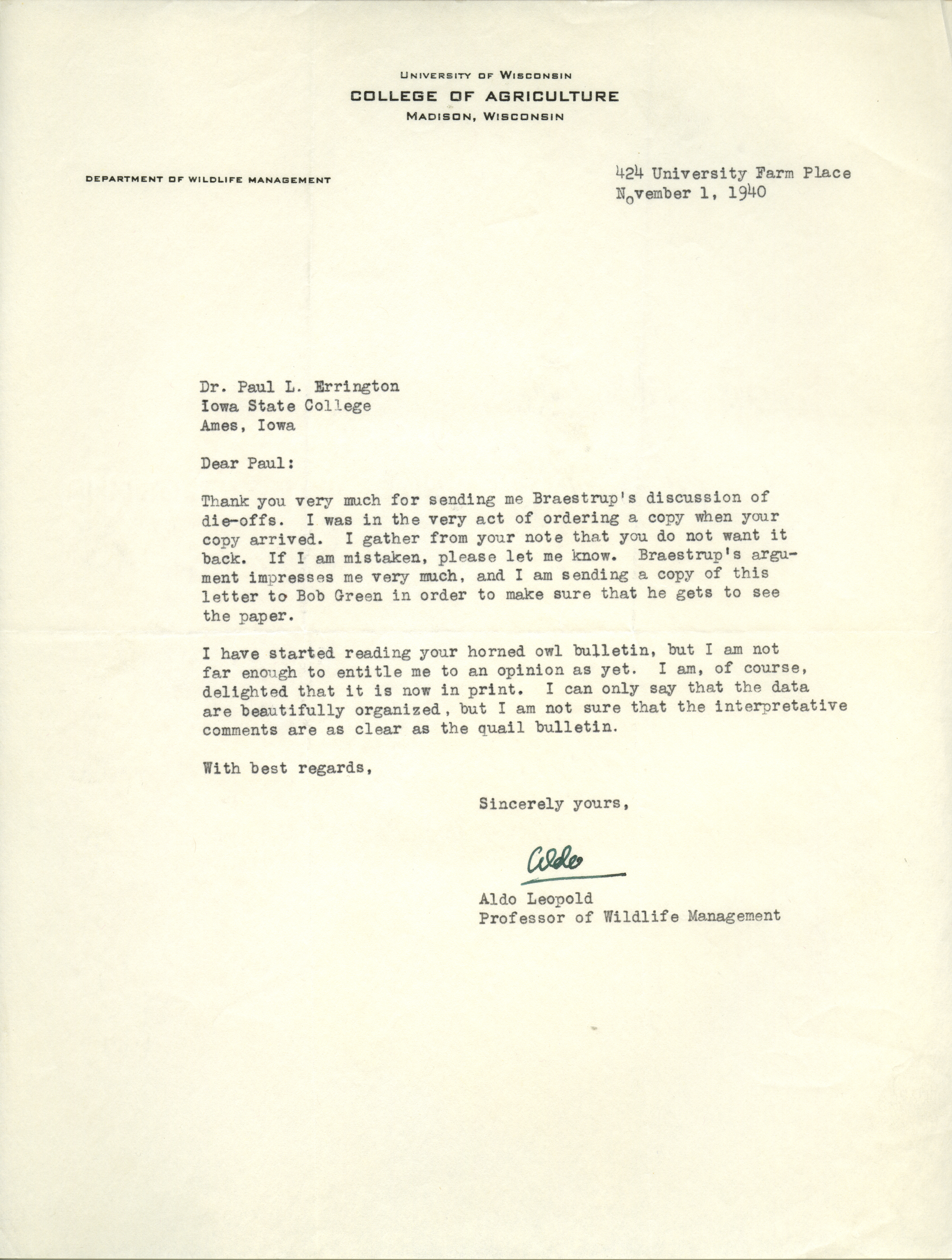 - Aldo Leopold letter to Paul Errington, November 1, 1940