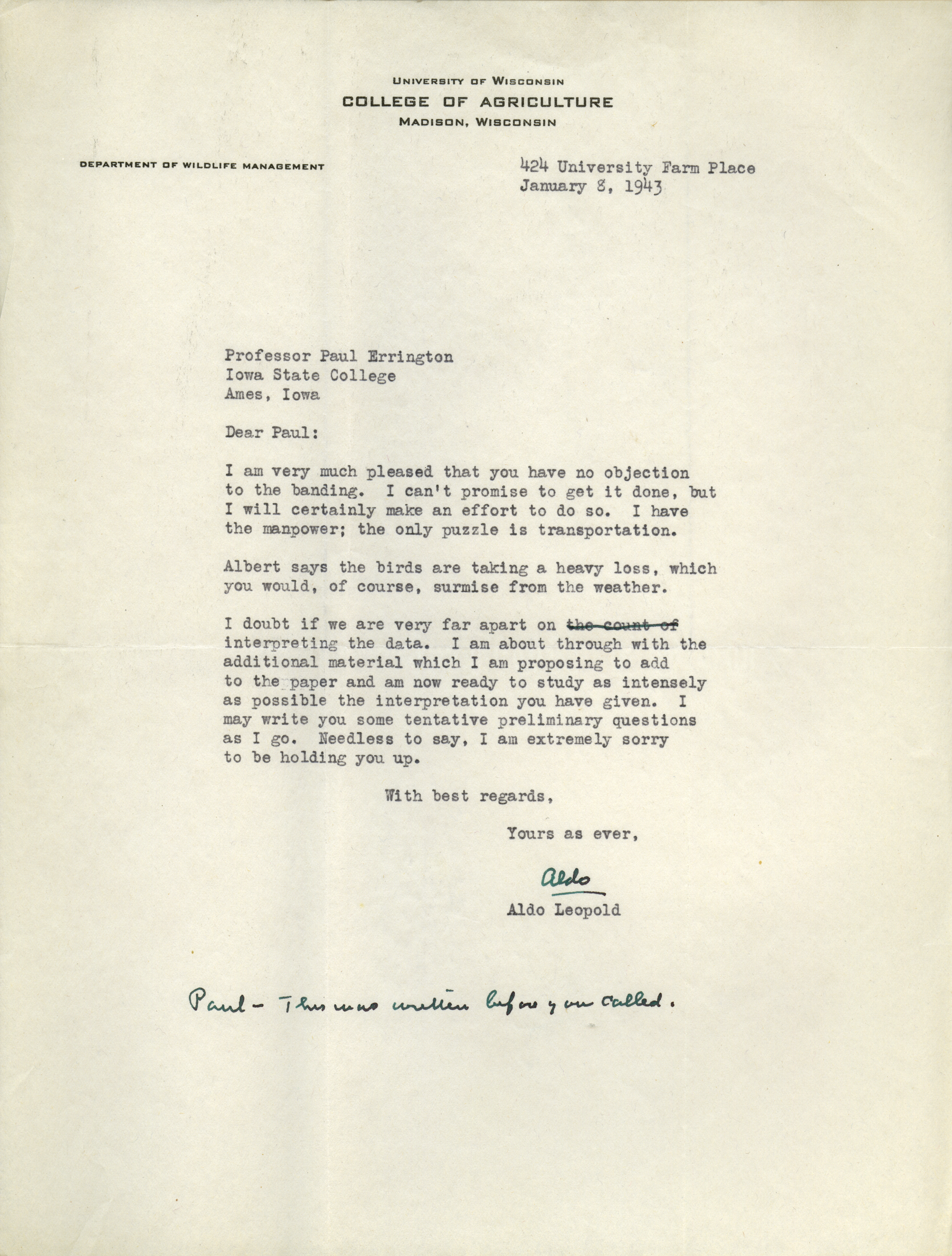 - Aldo Leopold letter to Paul Errington, January 8, 1943