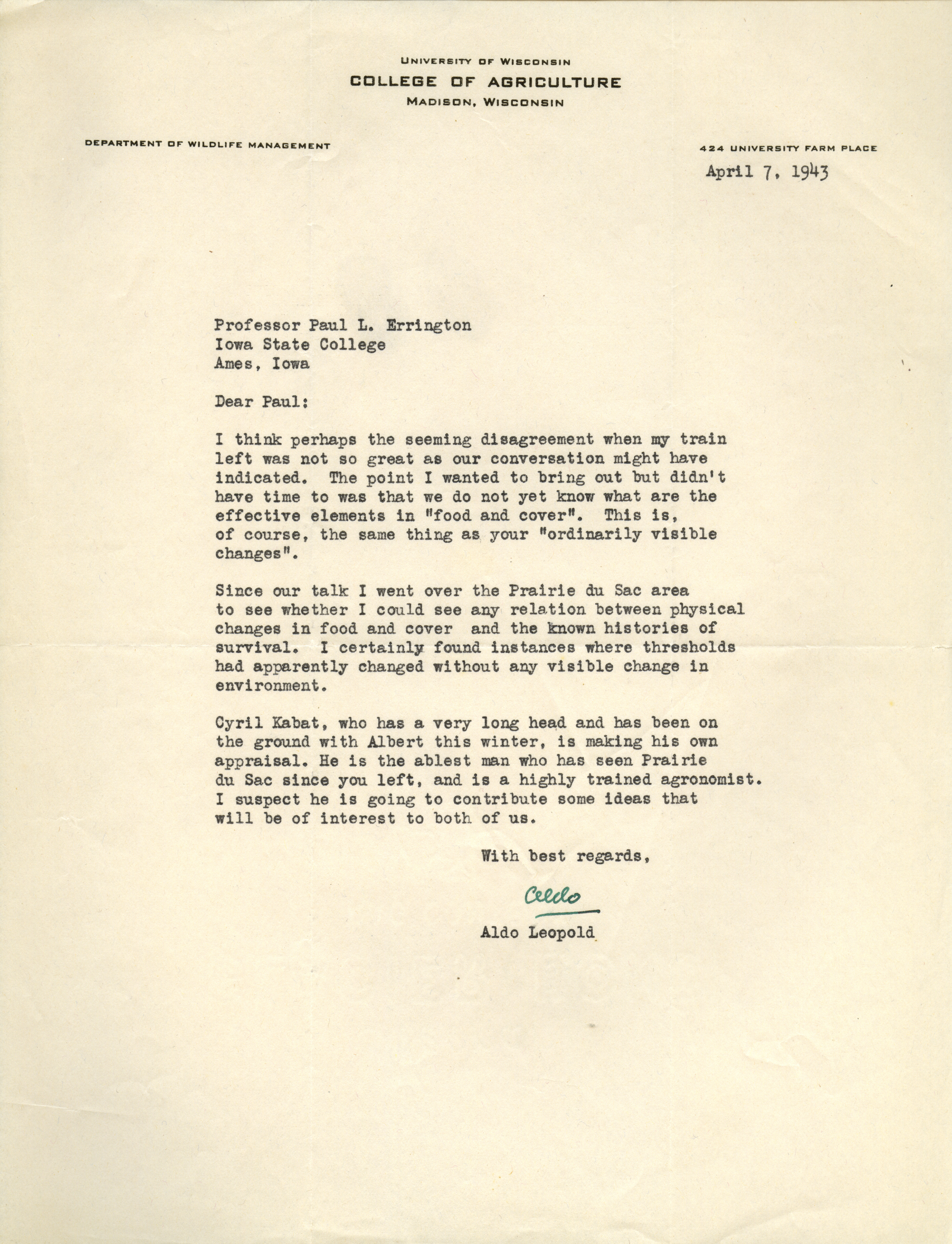 - Aldo Leopold letter to Paul Errington, April 7, 1943