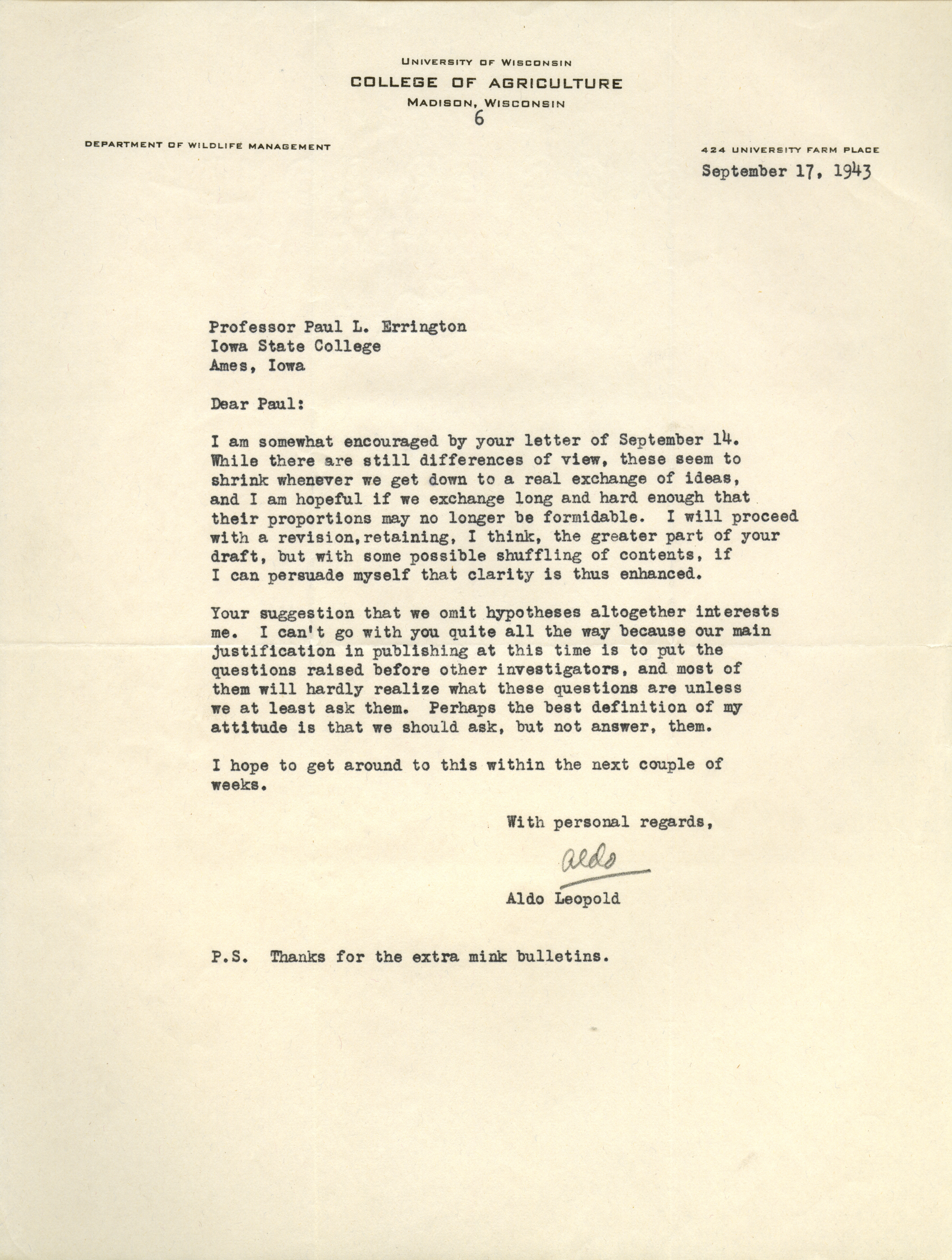 - Aldo Leopold letter to Paul Errington, September 17, 1943