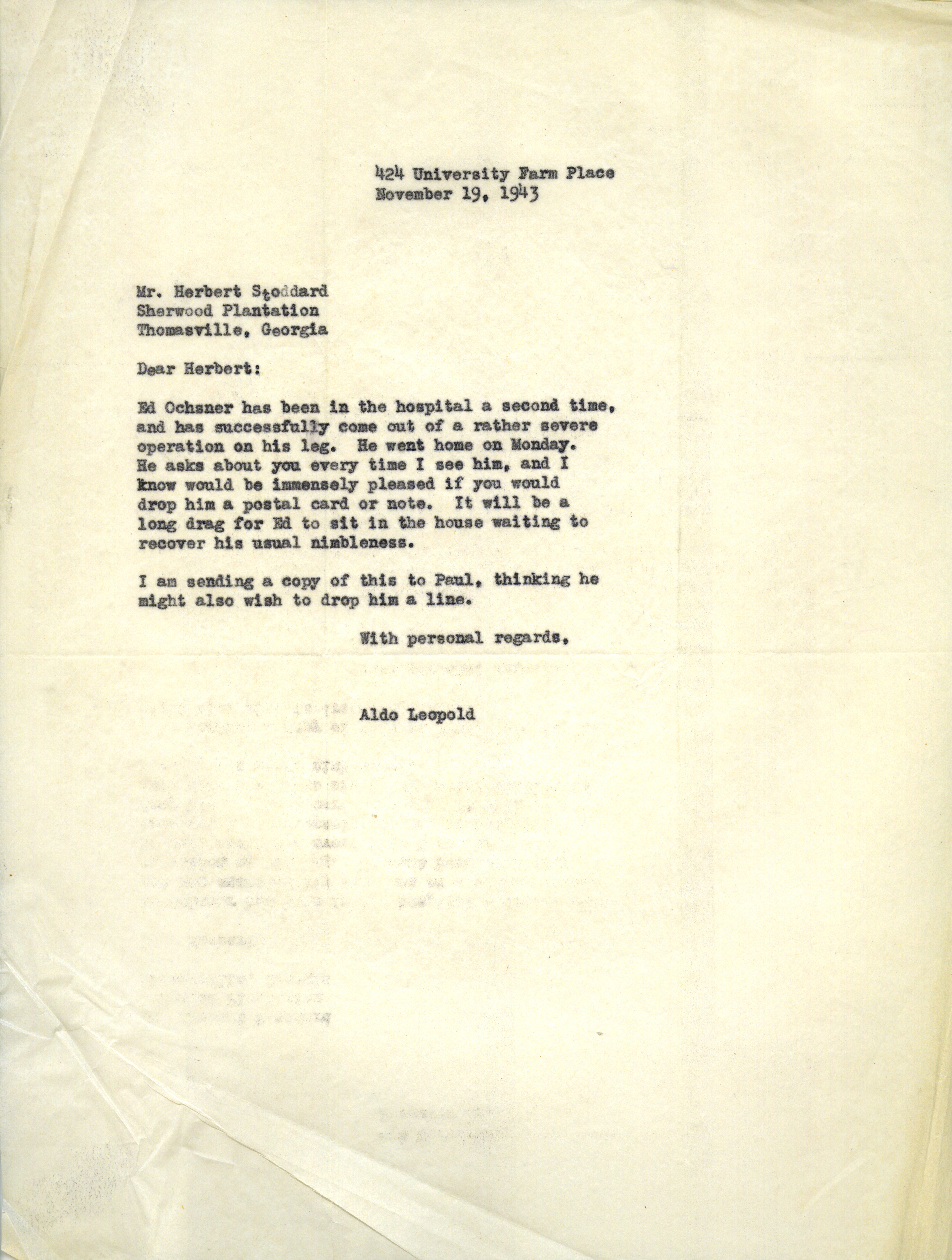 Aldo Leopold letter to Stoddard, November 19, 1943 Item Info
