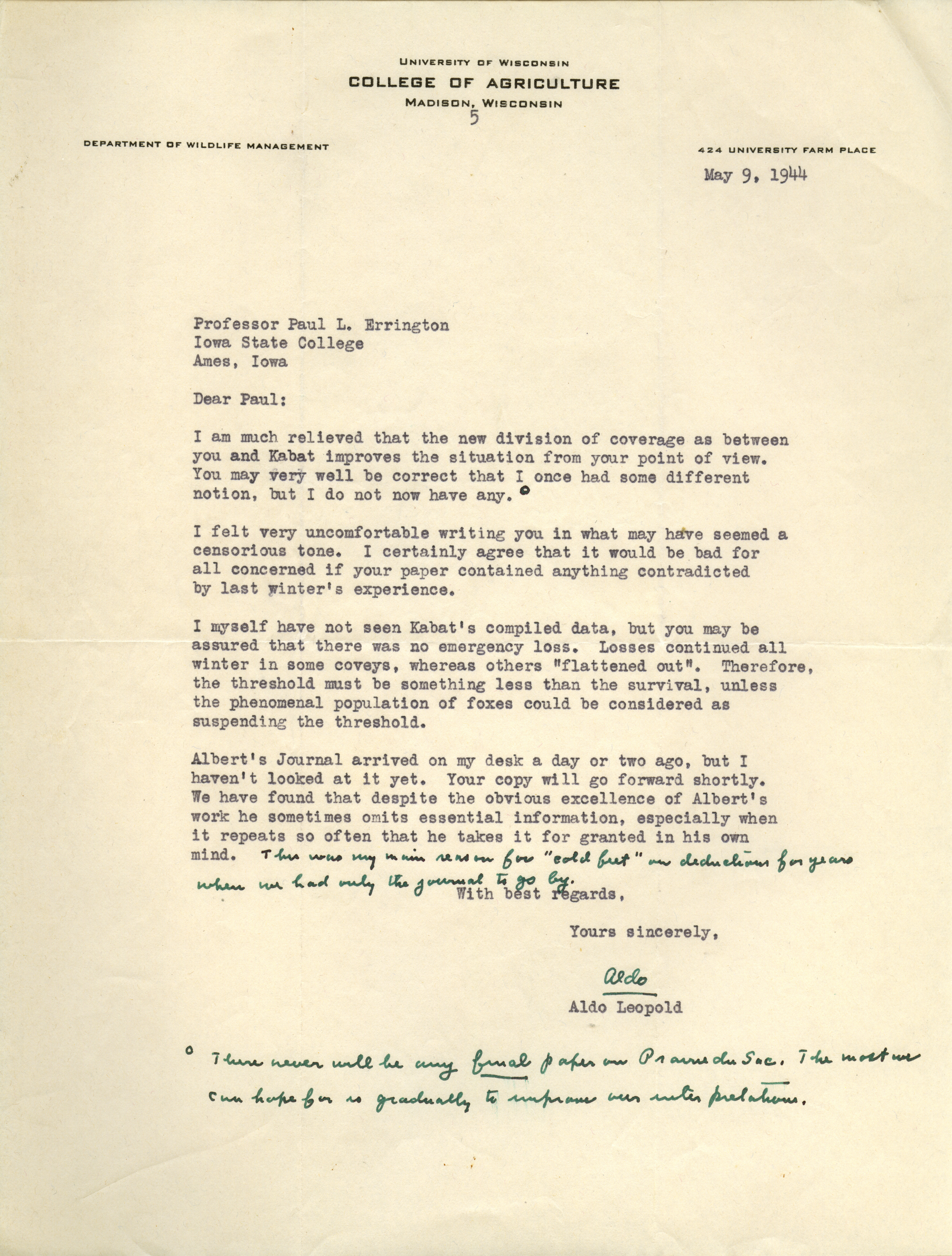 - Aldo Leopold letter to Paul Errington, May 9, 1944
