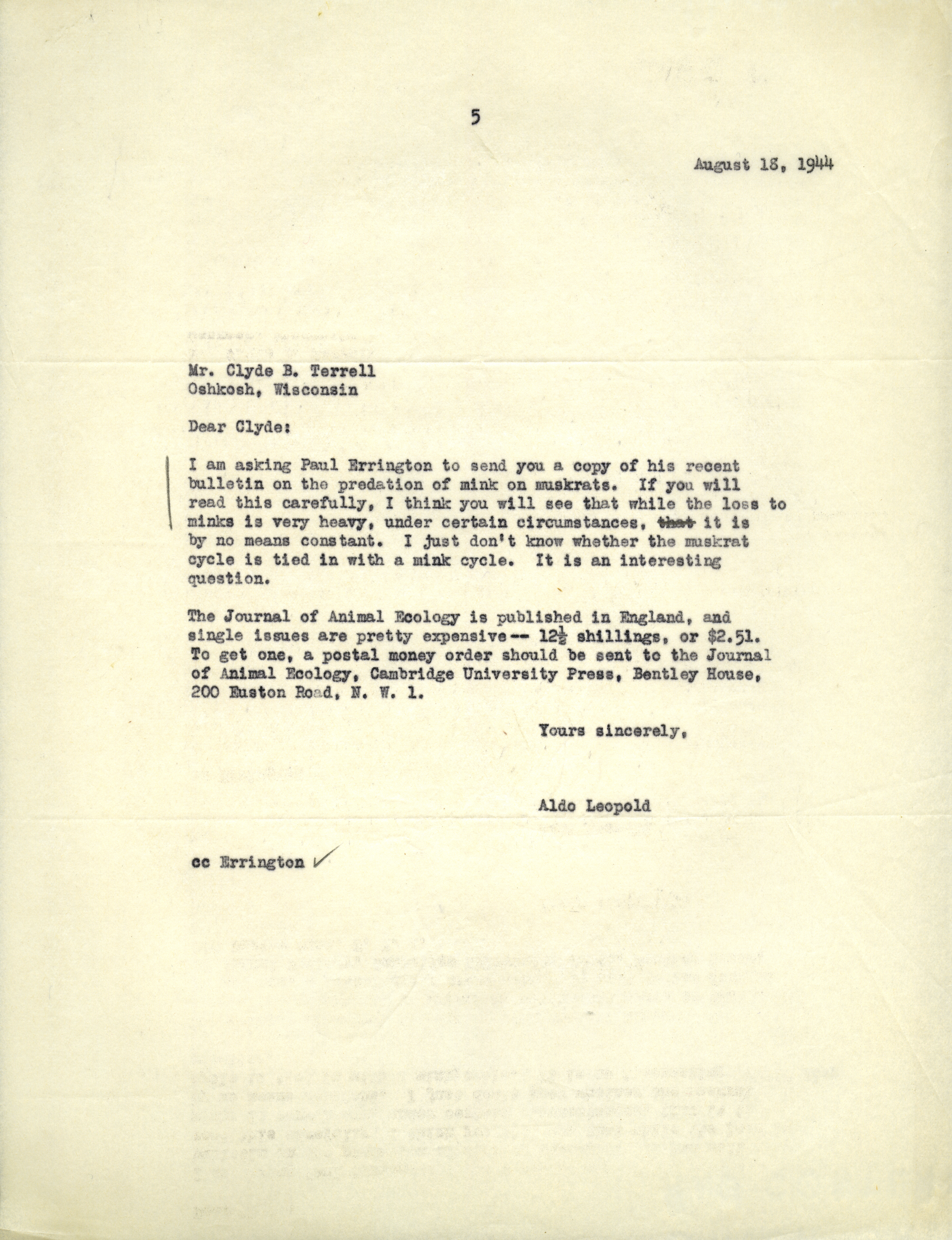 Aldo Leopold letter to Terrell, August 18, 1944 Item Info