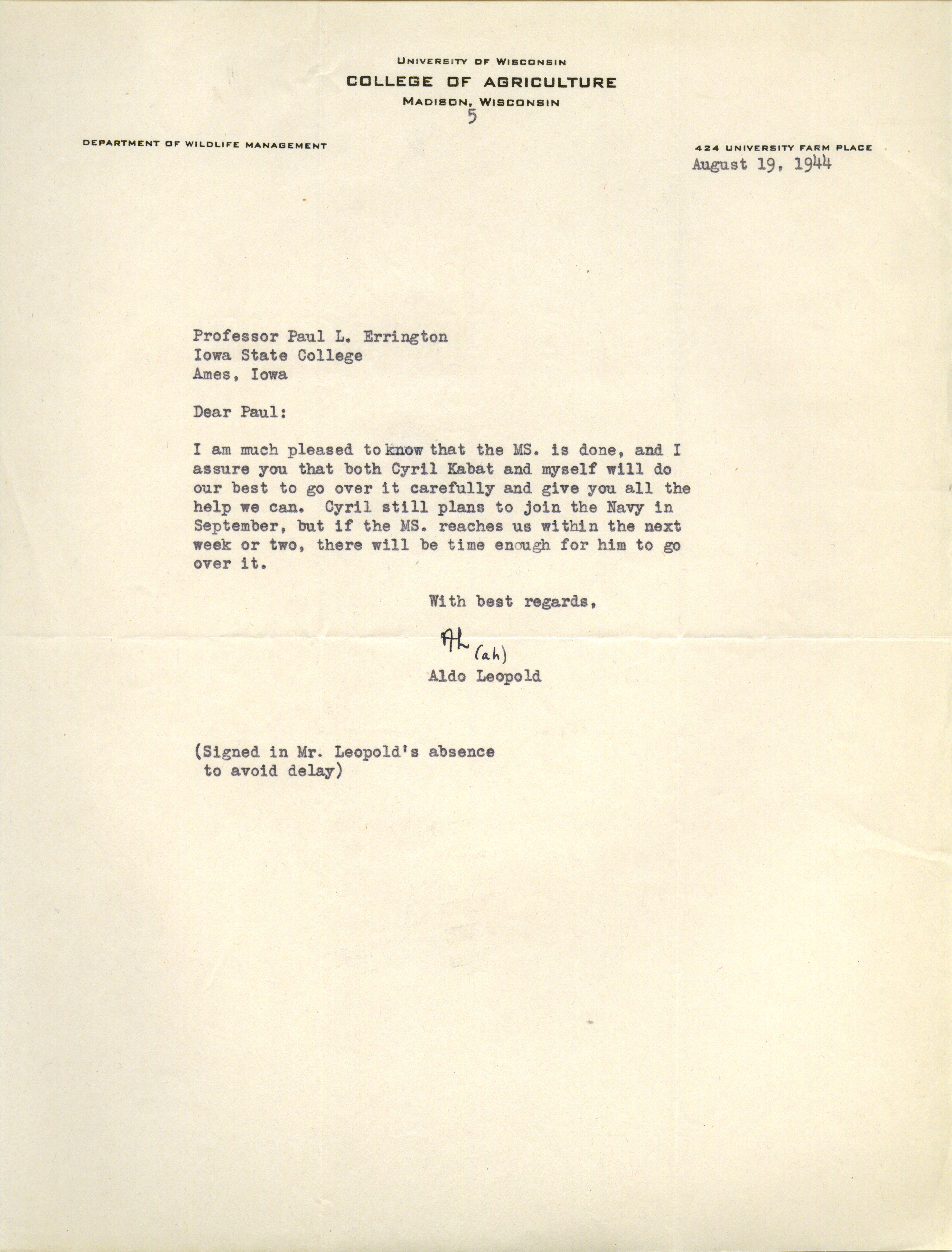 - Aldo Leopold letter to Paul Errington, August 19, 1944