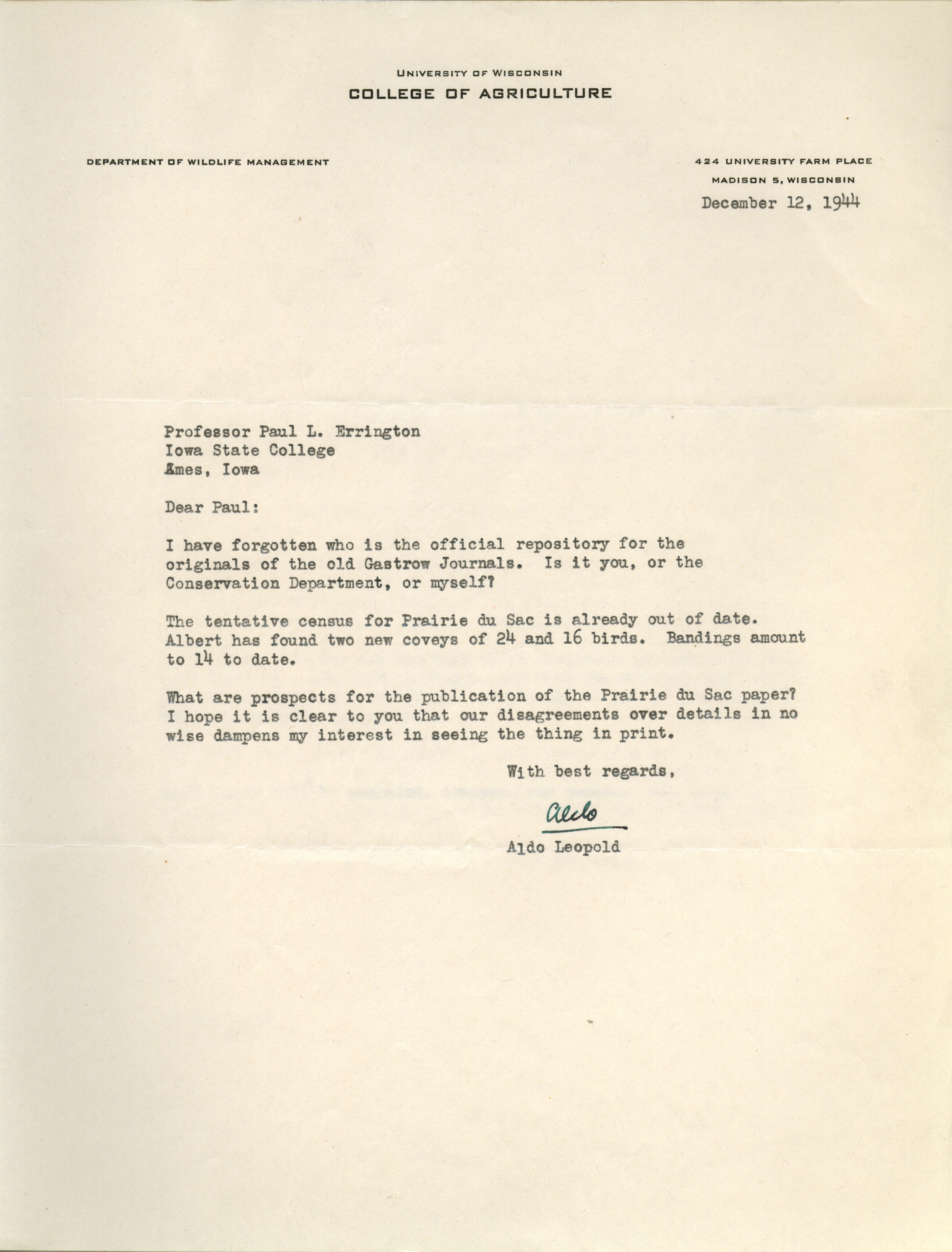 - Aldo Leopold letter to Paul Errington, December 12, 1944