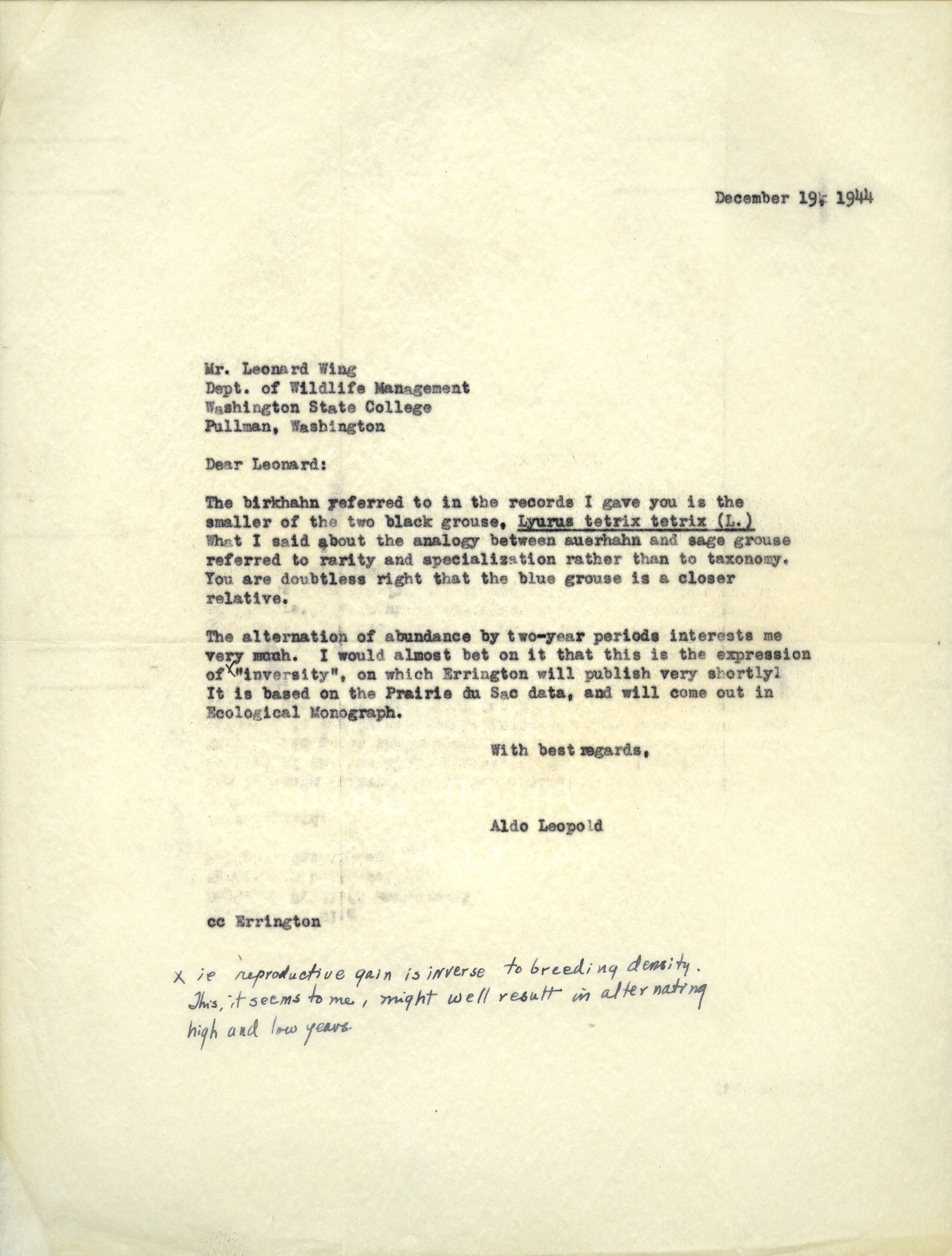 Aldo Leopold letter to Wing, December 19, 1944 Item Info