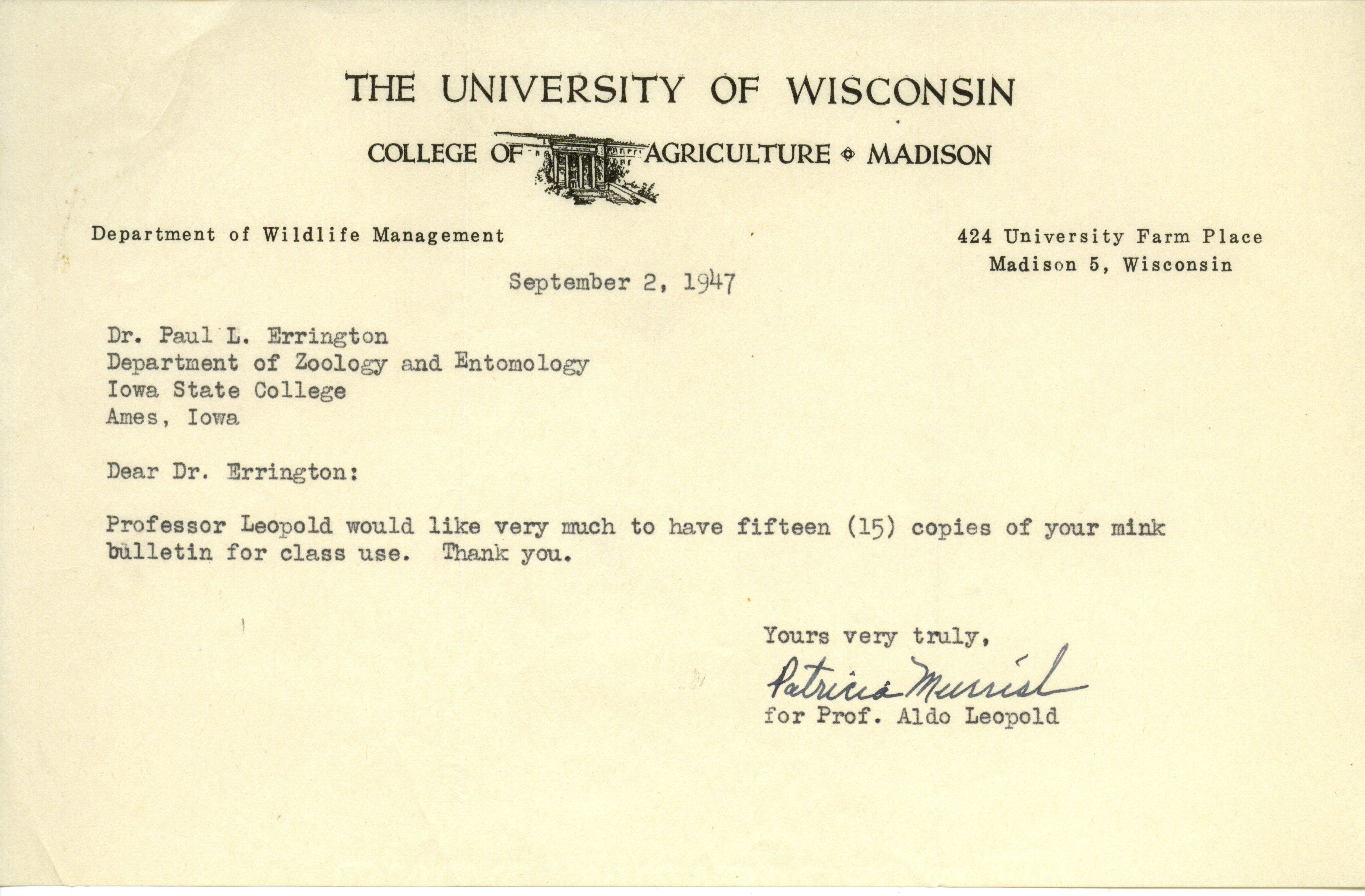 - Aldo Leopold letter to Paul Errington, September 2, 1947