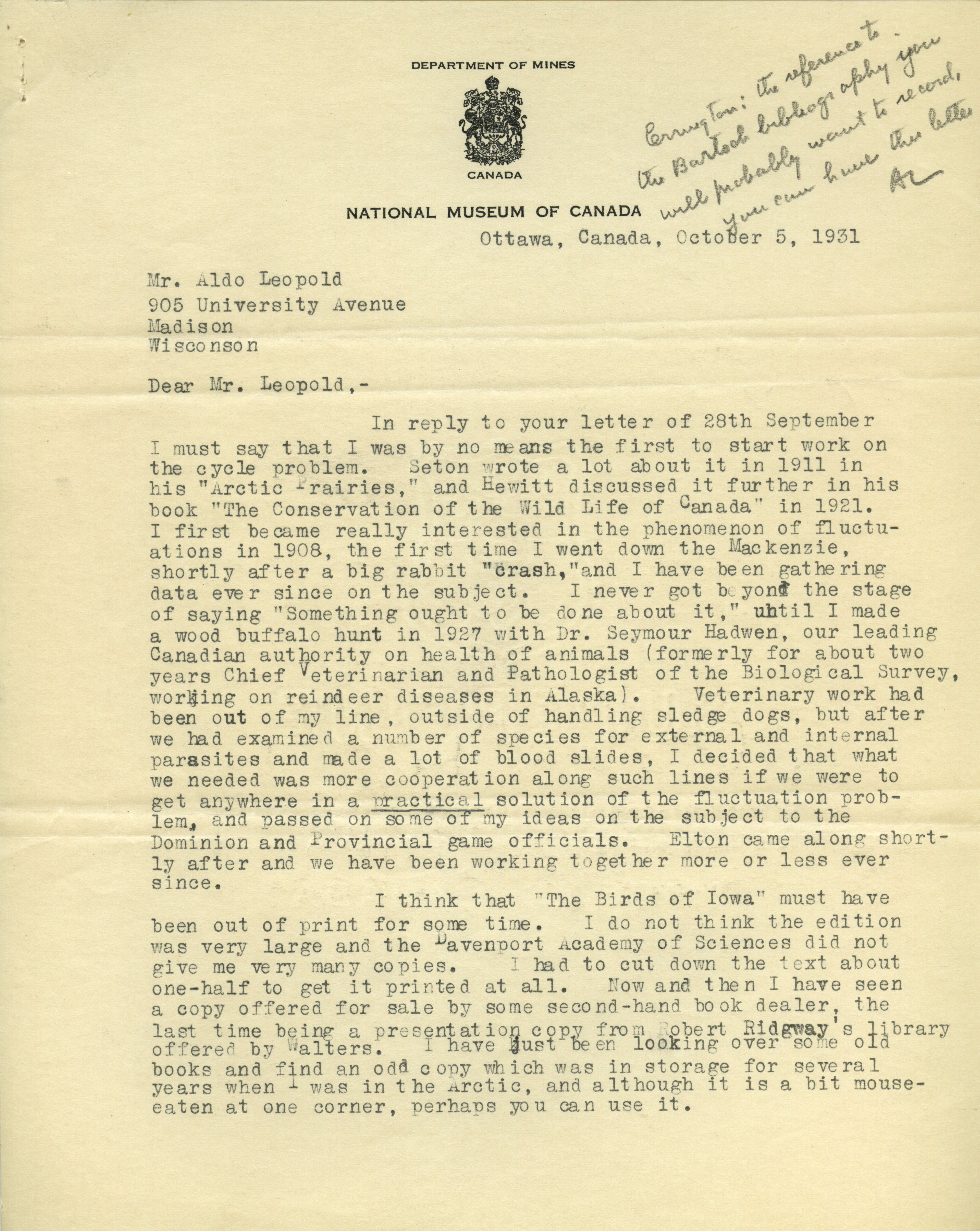 - Letter from Anderson to Aldo Leopold, October 5, 1931