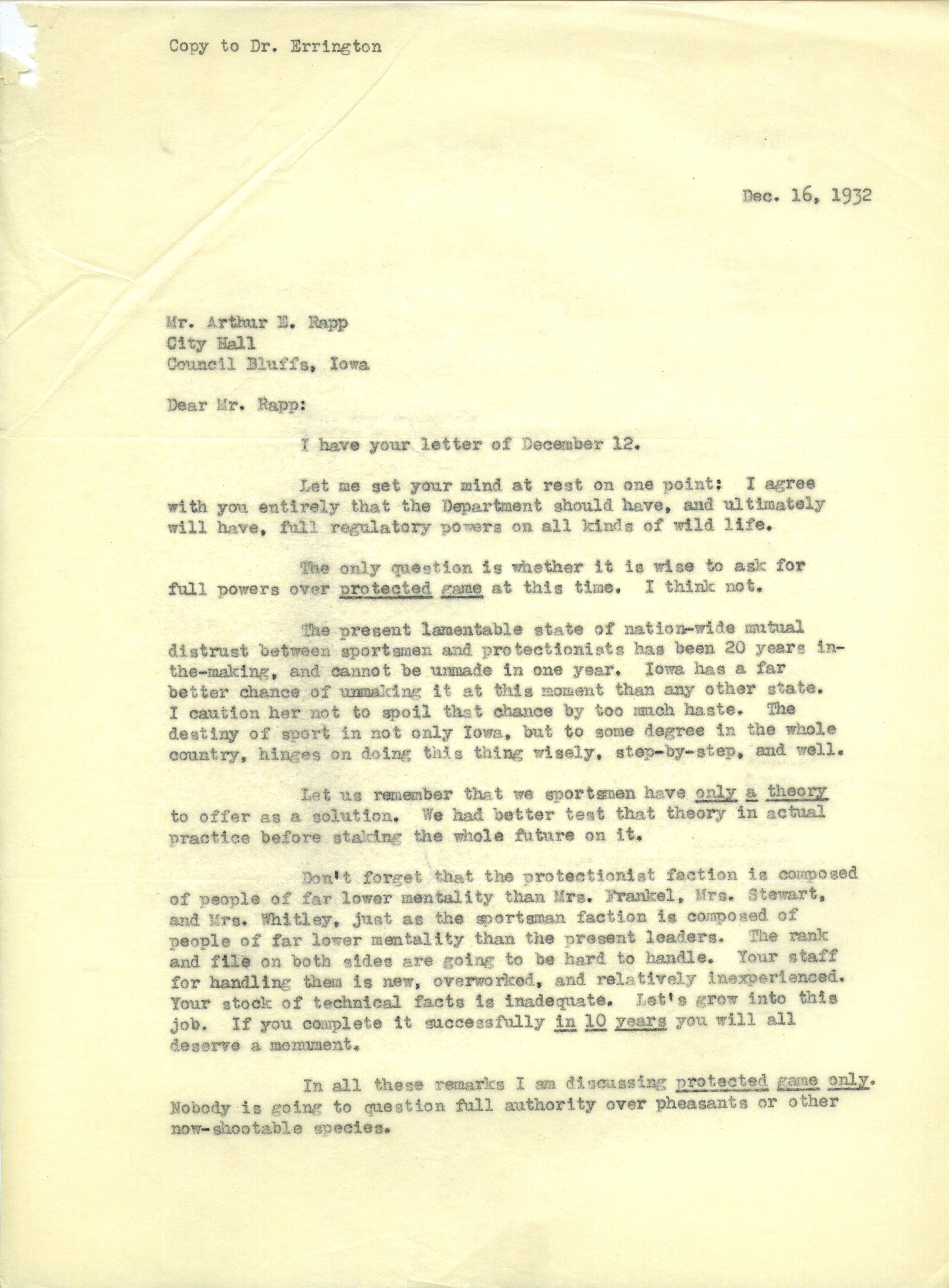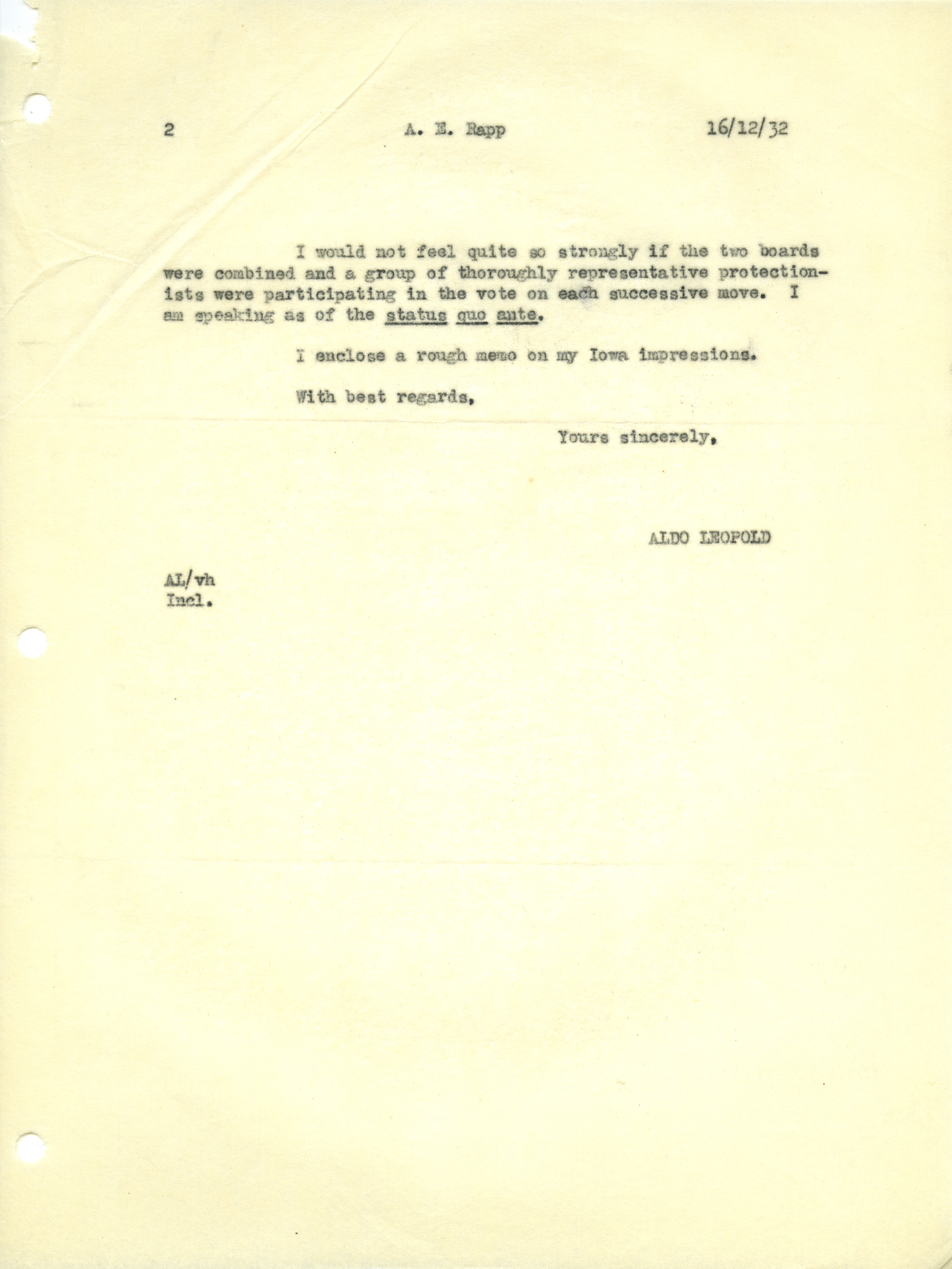 - Aldo Leopold letter to Rapp, December 16, 1932
