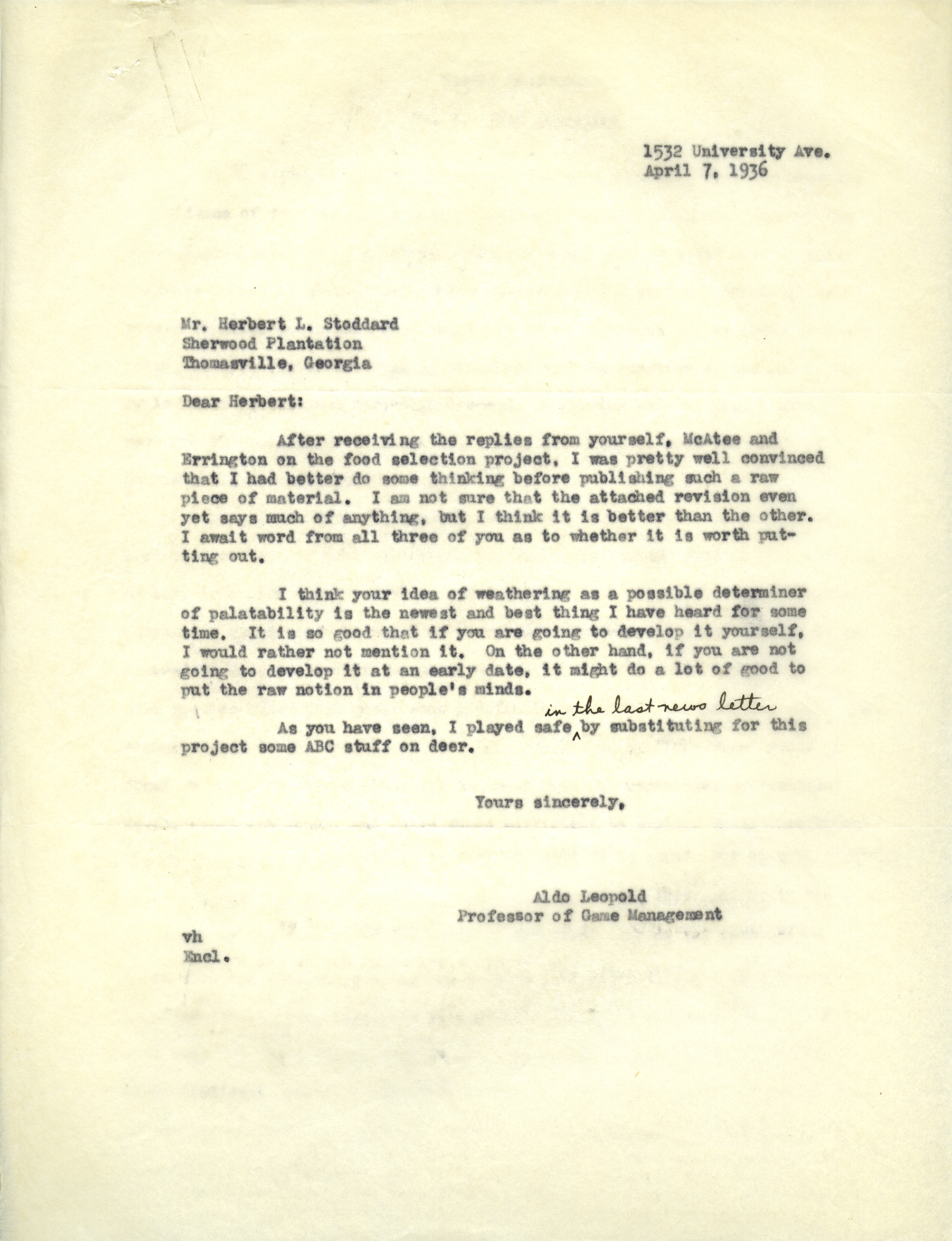 - Aldo Leopold letter to Stoddard, April 7, 1936