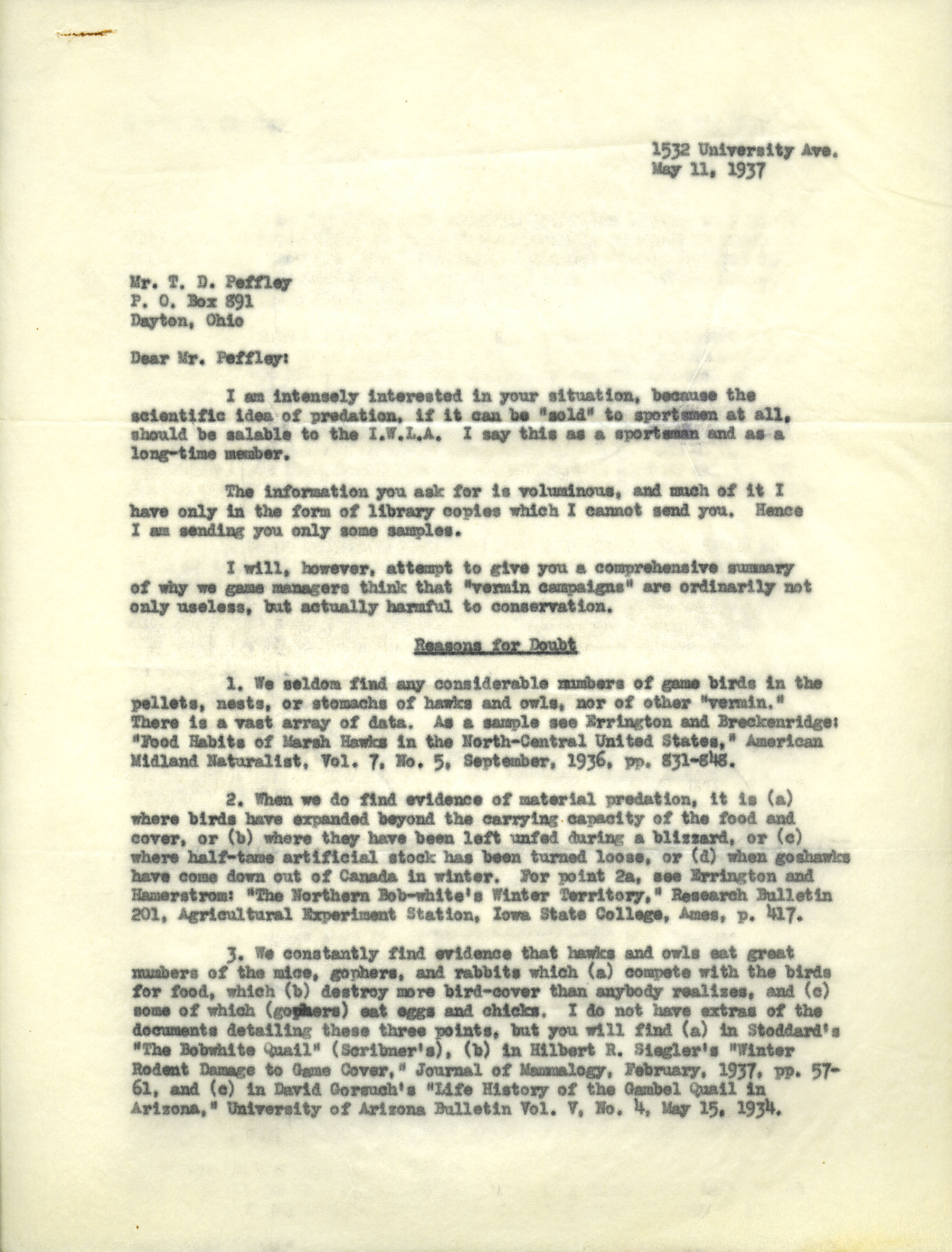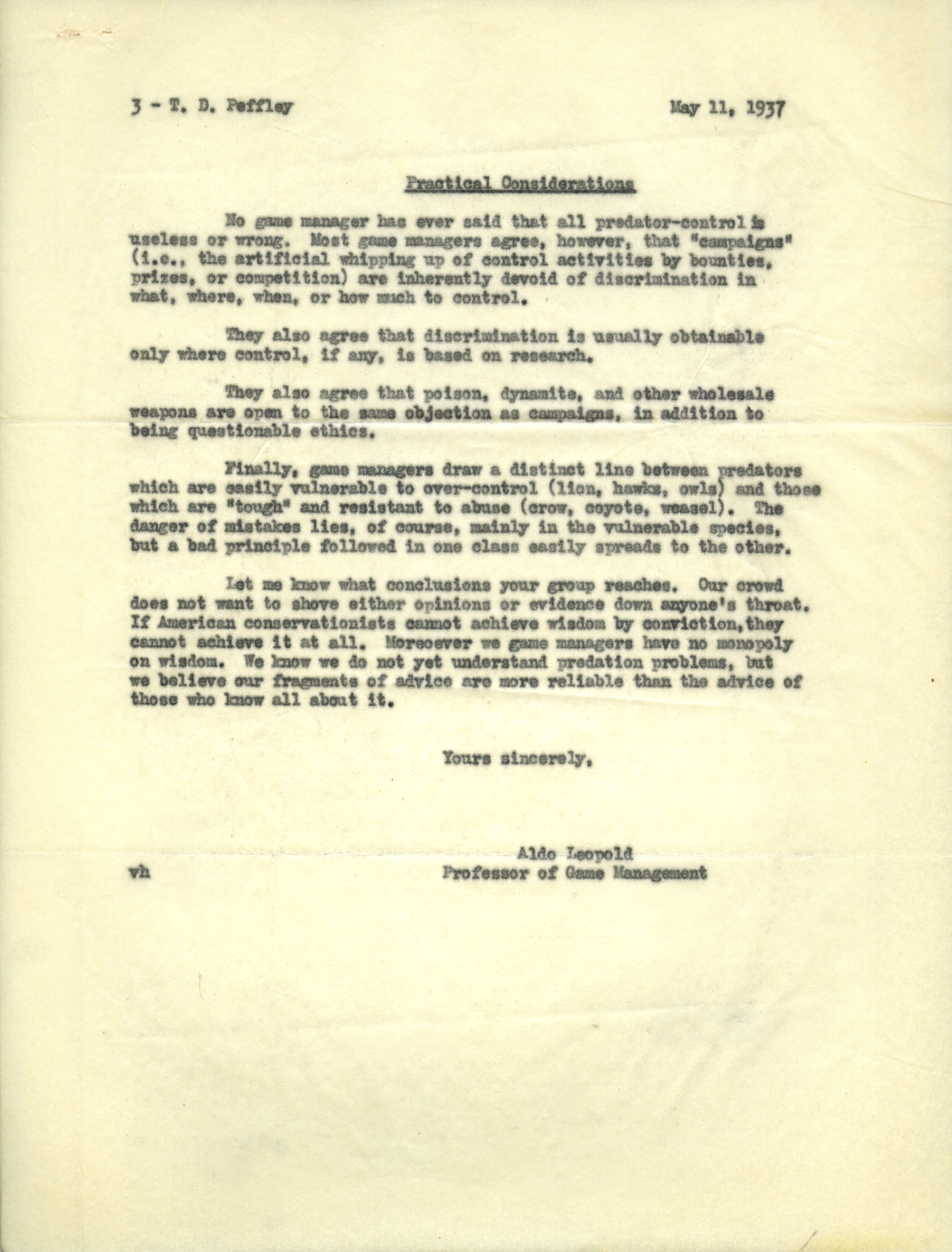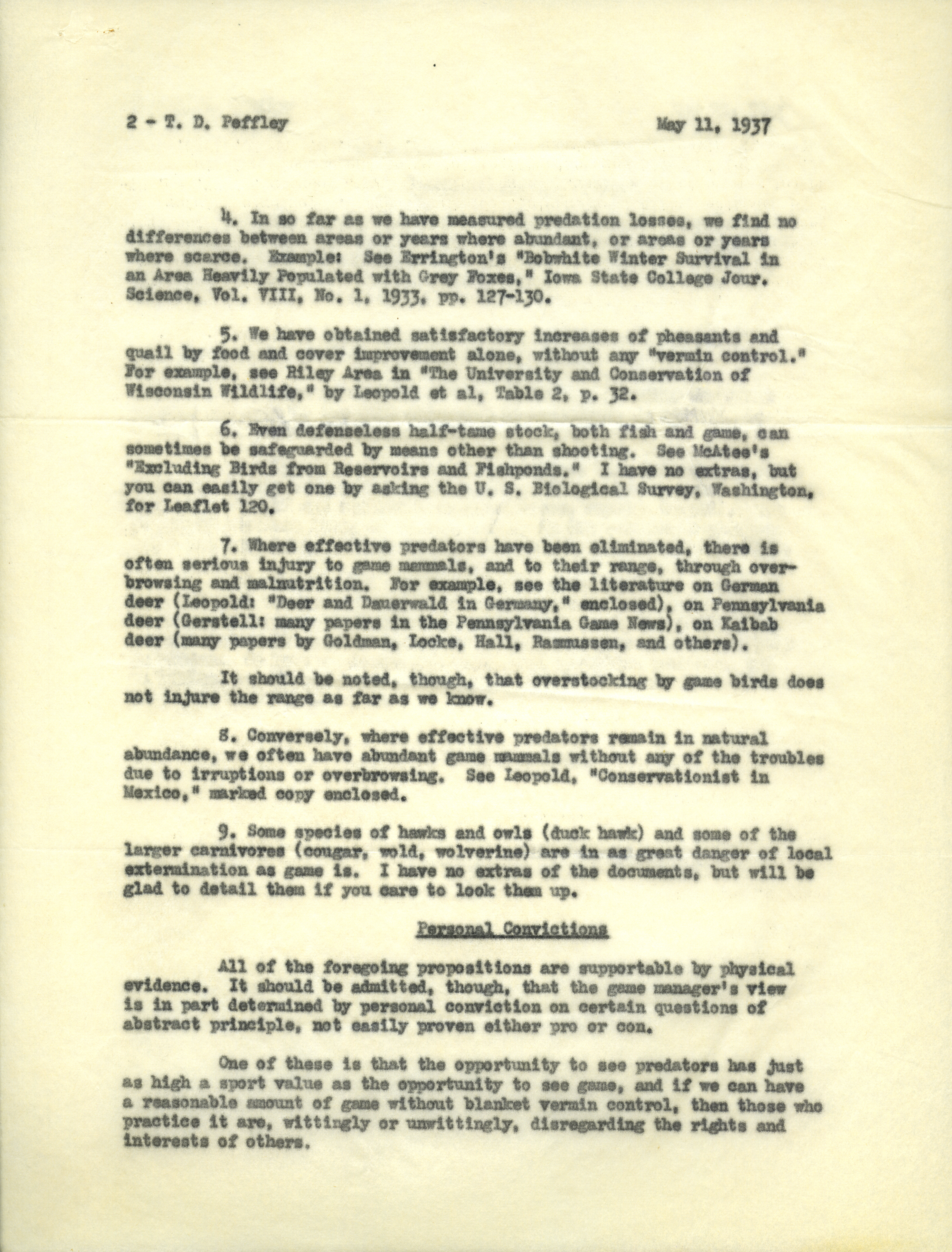 - Aldo Leopold letter to Peffley, May 11, 1937