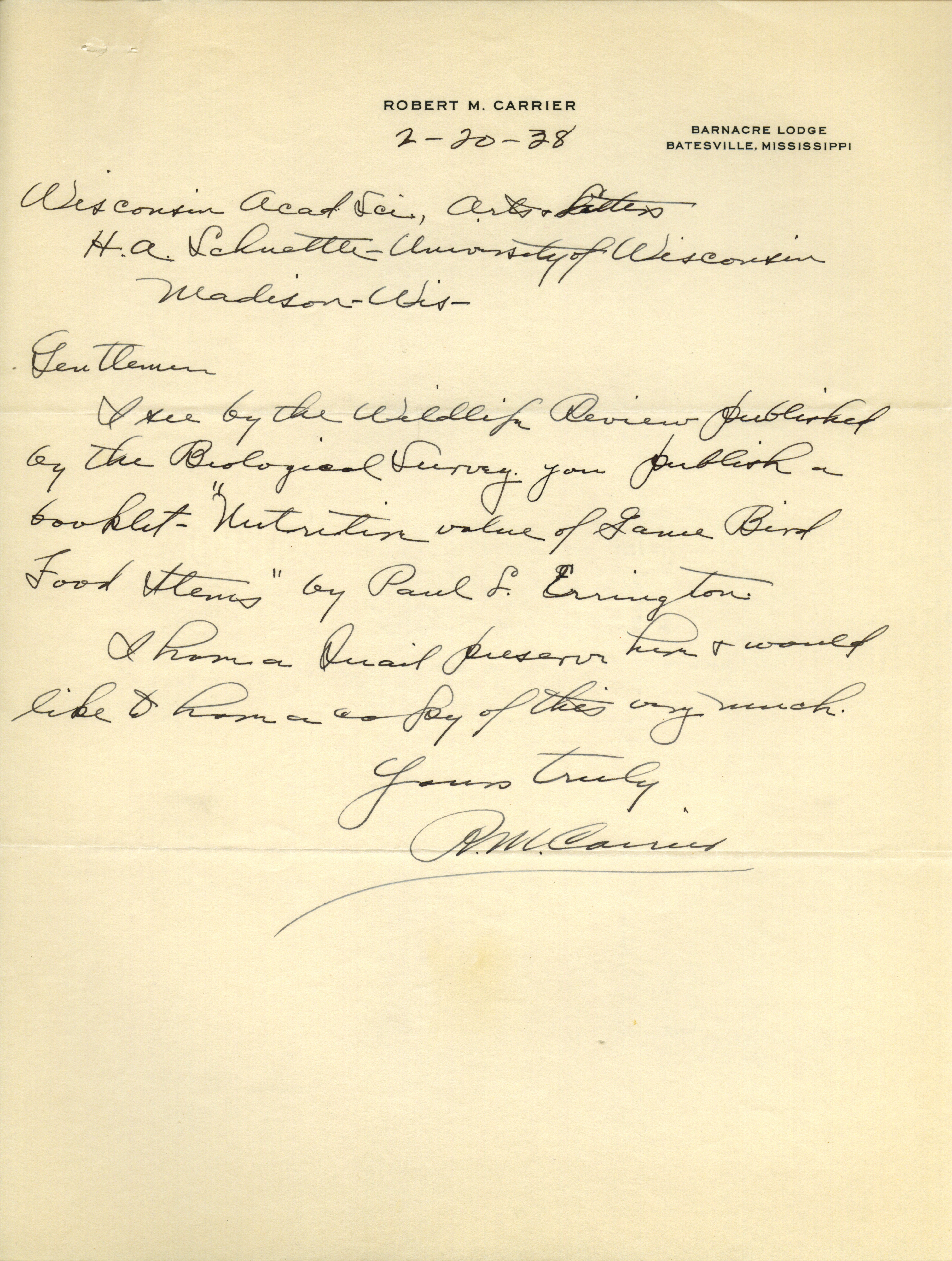- "Aldo Leopold letter to Carrier, February 26, 1938", Paul L. Errington Collection, Iowa State University Library Digital Collections